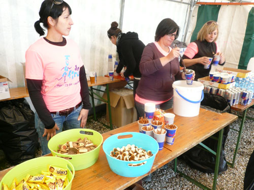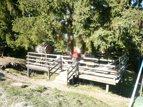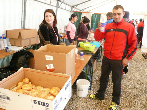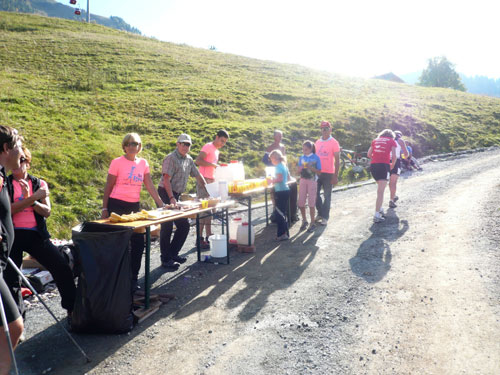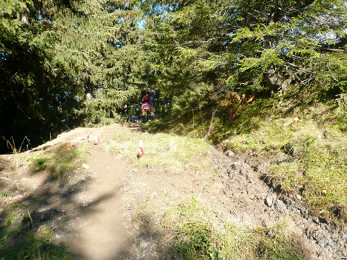 Die Piste wird immer rustikaler und beschwerlicher, aber irgendwann meine ich, müsste langsam doch das 41er erscheinen. Nach Durchqueren eines kleinen Wäldchens kann ich das Schild ausmachen, meine Enttäuschung ist allerdings doch riesen groß. Man hat hier noch eine 40,5 km-Markierung dazwischen geschoben, der Raumgewinn ist also doch beträchtlich geringer als ich dachte. Hilft mir natürlich jetzt auch nicht weiter, irgendwie muss es ja weiter gehen. Nach einer Kuppe gibt es dafür wieder einen Versorgungsstand. Energy Shot und Cola müssen bei mir wieder für etwas Auftrieb sorgen. Und es geht jetzt auch glücklicherweise wieder etwas leichter weiter, weil wir die Wiese überwunden haben und auf einem ausgetrampelten schattigen Pfad diagonal über den Hang geleitet werden. Mittendrin steht auch die ersehnte 41er-Markierung. Puhh, der Gipfel muss wirklich beinhart erarbeitet werden.