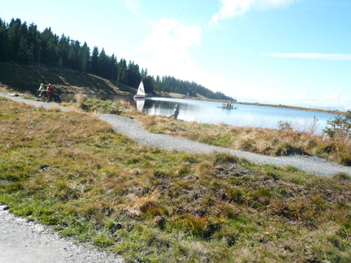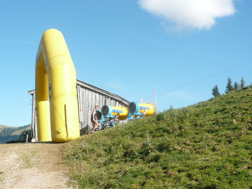 Aber bevor wir den finalen Schlussanstieg zum Gipfel in Angriff nehmen, geht es erst noch weitere 4 km abwärts um den Berg herum auf die andere Seite. Die kompletten Downhill-Kilometer vom Hartkaiser herunter sind überwiegend hervorragend zu laufen, es gibt kaum einmal ein steileres Stück wo man so richtig die Bremsen einsetzen muss. An der Erlebniswelt Hexenwasser in Höchsöll (km 39) beenden wir unsere rasante Abfahrt. An über sechzig feucht-fröhlichen Stationen zum Thema Wasser können sich hier Kinder verführen lassen. Der vielfach ausgezeichnete Wasserspielpark lädt dazu ein, die Schönheit und Kraft des Bergwassers mit allen Sinnen zu genießen und den Wert sauberen Wassers wieder erfahrbar zu machen. Der Umstand beschert uns auch einiges an Zuschauerunterstützung. Beim Durchlauf werden wir zuerst von einem Sprecher und dann von vielen Zuschauern begrüßt.
