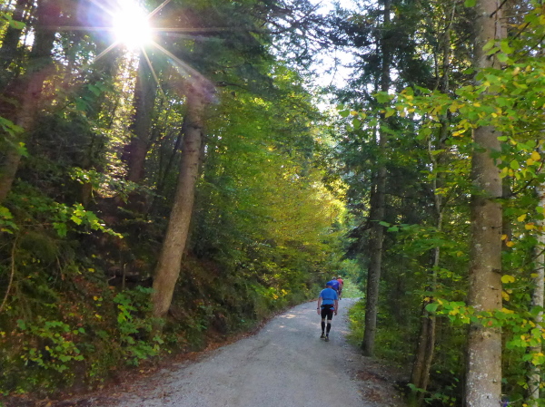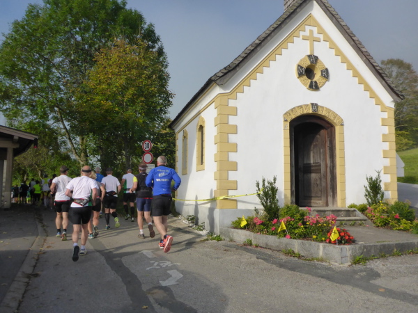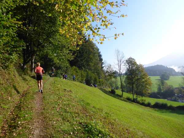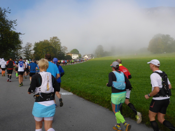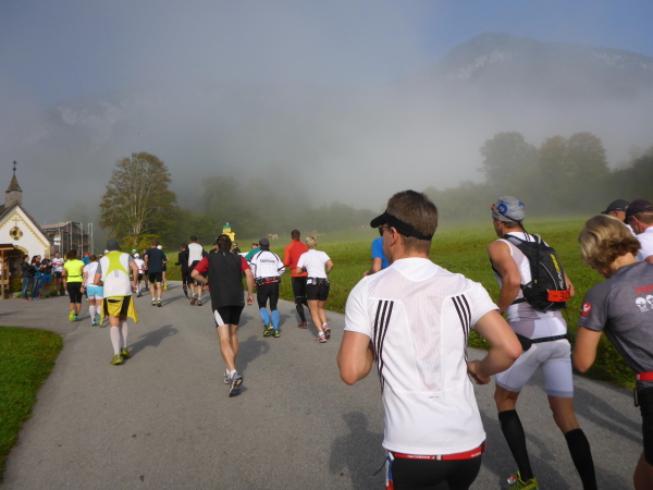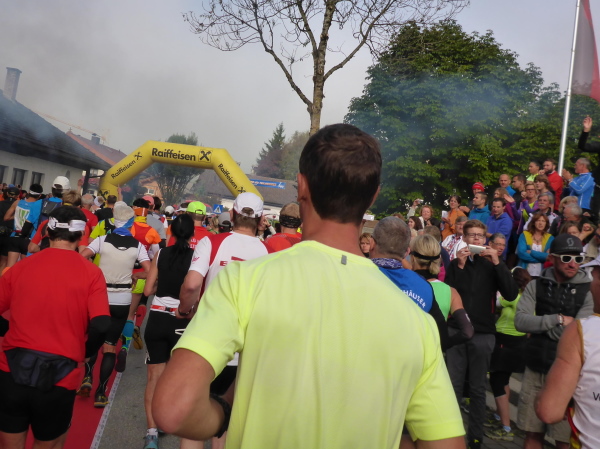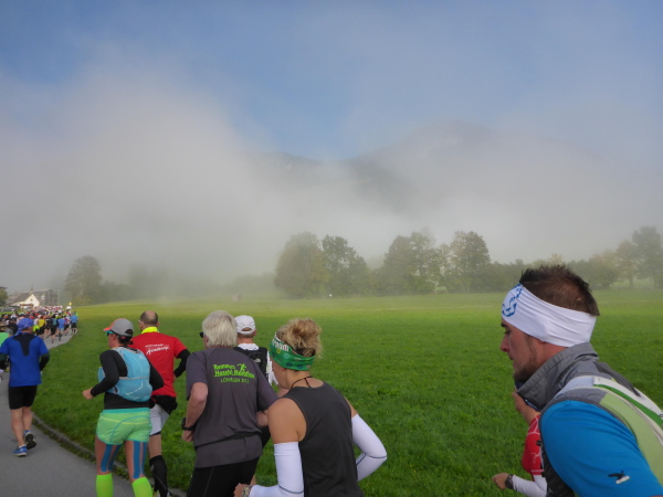 Dann ertönt der erlösende Startschuss aus der Kanone und das Feld setzt sich in Bewegung. Es geht in die Richtung, aus der wir gestern gekommen sind, also erst mal den Berg hinauf bis zur kleinen Kapelle. Von dort führt ein schmaler Weg wellig weiter. Dichter Nebel hängt in der Felsenwand des Pölven, während wir bereits in der Sonne laufen. Es geht durch die kleinen Gehöfte von Ried inmitten grüner Weidelandschaft mit vielen Kühen. Vor uns hat sich das Feld schon weit auseinander gezogen. Wenn man rechts den Hang hinaufschaut kann man auf halber Höhe hin und wieder farbige Läufershirts ausmachen. So weit ist die Spitze bereits enteilt.