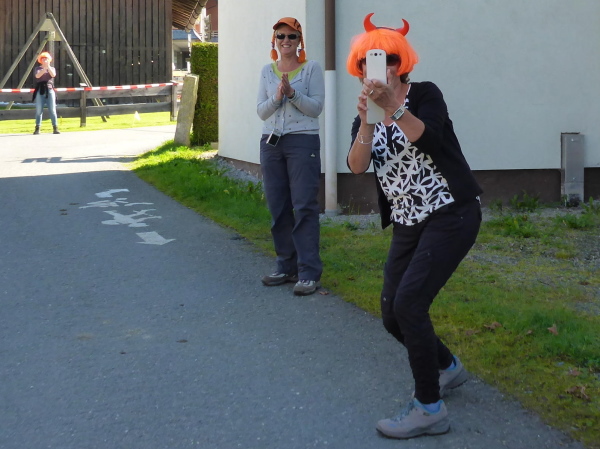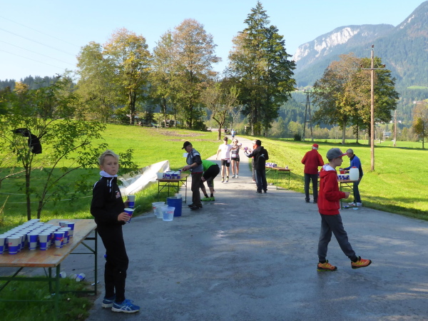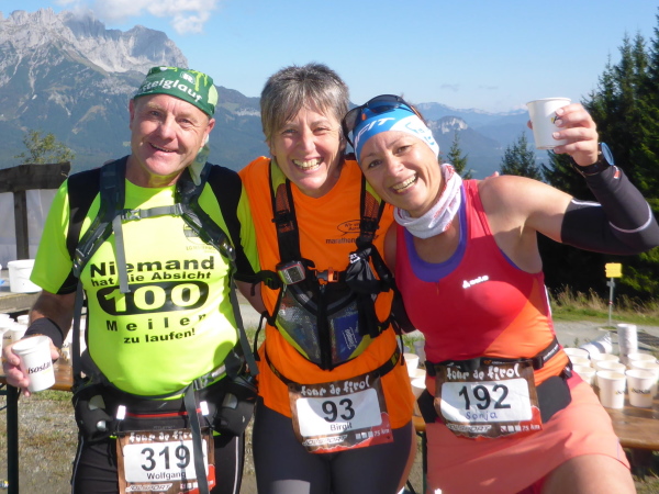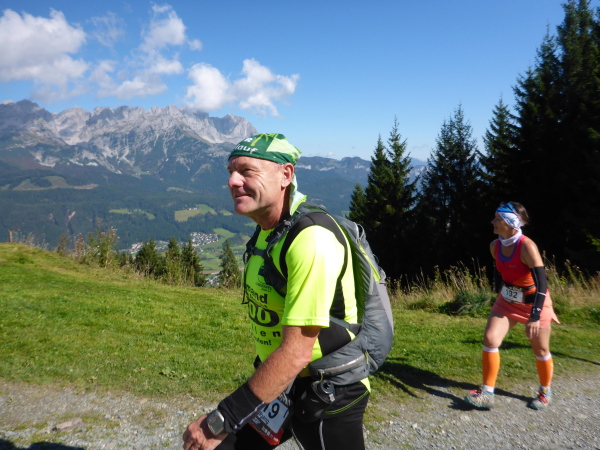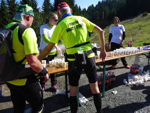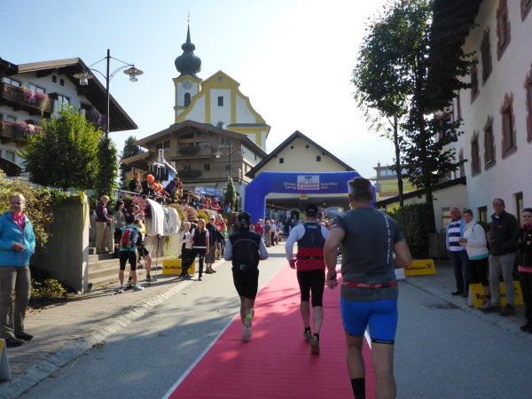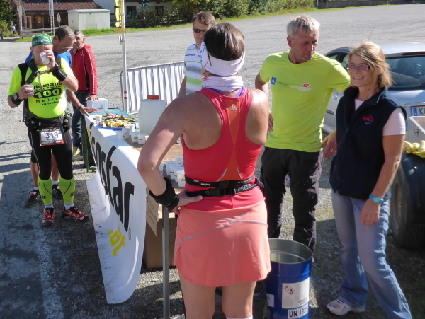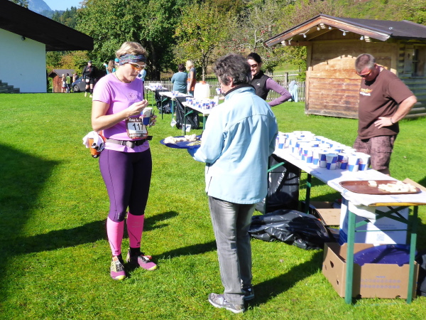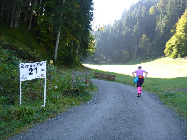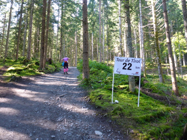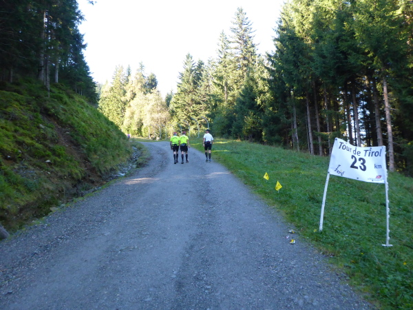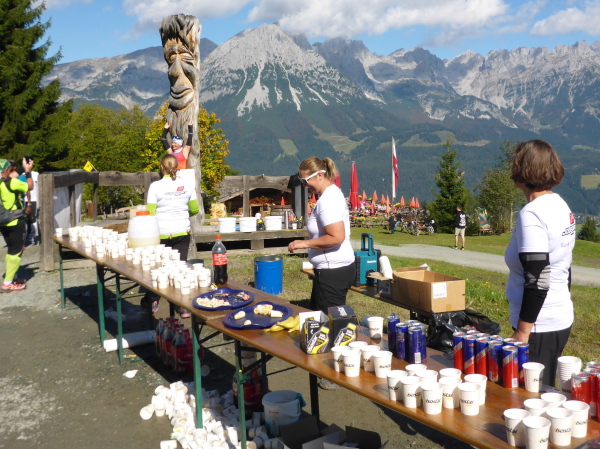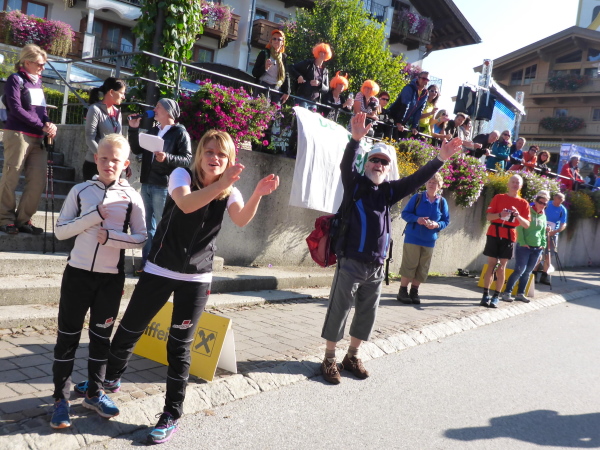 Drei holländische Fans mit schreiend orangefarbigen Haaren feuern mich an. Sie warnen mich vor der nahen Straße. Hier stehen Helfer und halten die Autos an. Dann laufe ich auf die Skistation Ellmau zu. Hier befindet sich die nächste VP mit Zeitmessung und im ungünstigsten Fall ein cut off. Da haben wir aber noch über 15 Minuten Luft. Streckenmäßig ist jetzt die Hälfte geschafft.