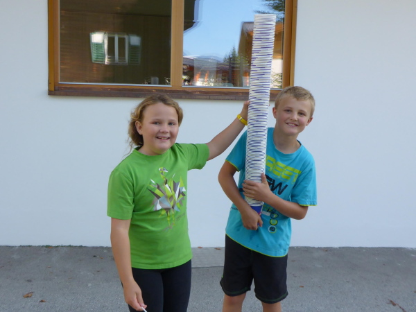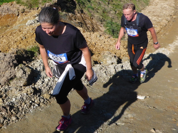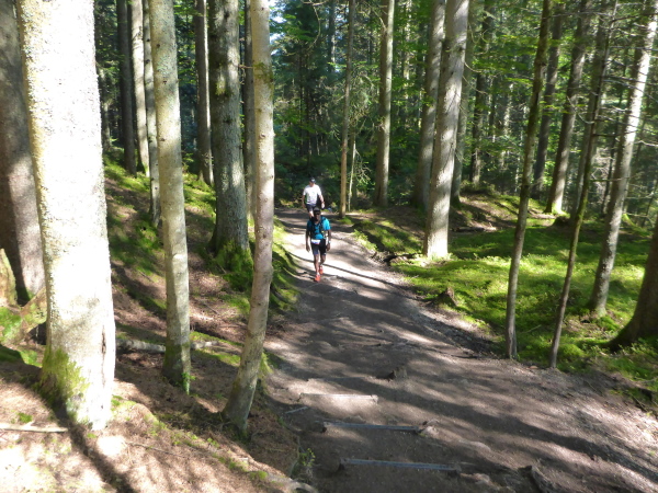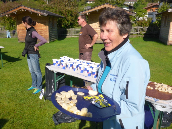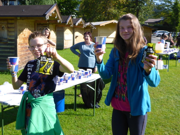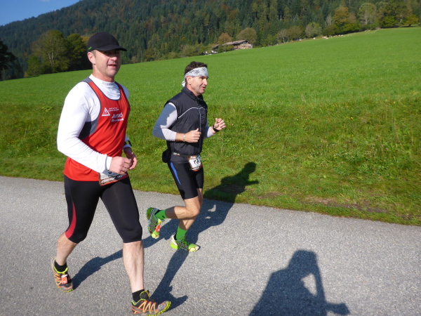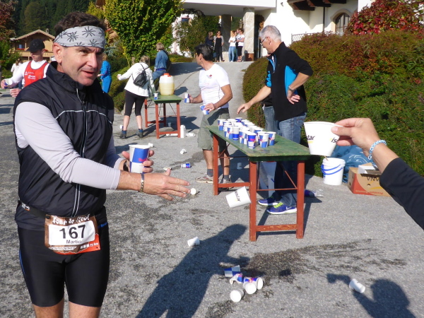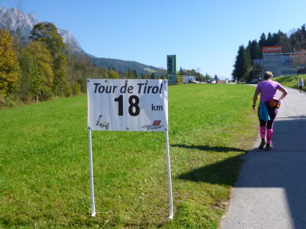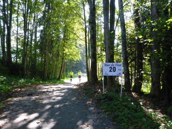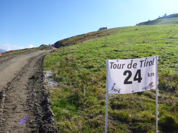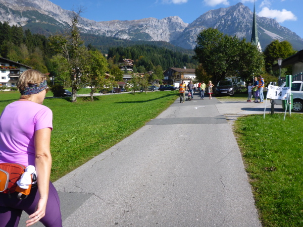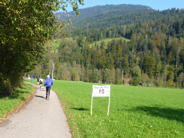 Hinter km 3 geht es dann die Straße hinauf und oben auf Feldwegen nach Söll zurück. Am Hotel Alpenschlössel gibt es etwas zu trinken. Mir ist schon richtig warm und so greife ich gerne zu. Die Straße führt auf einen schmalen Pfad und weiter auf die 10 Kilometerstrecke vom Vortag, nur in entgegengesetzter Richtung. Wo wir gestern hinauf mussten, geht es nun bergab. So sind wir nach 8 Kilometern wieder im Startbereich in Söll, wo noch immer Schaulustige auf uns warten.