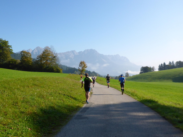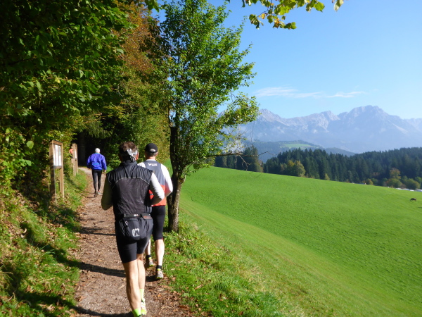 Wir verlassen den Marktplatz durch das Zeitmesstor. Am Ortsausgang liegt die nächste Getränkestelle. Hier gibt es zusätzlich zum Wasser auch Iso. Unter der hohen Brücke der B178 hindurch empfängt uns ein romantisches Flusstal. Der Stampfangerbach plätschert hier gen Tal. Am Hundesportplatz vorbei müssen wir die B 173 überqueren um bei km 10 auf eine freie Weidelandschaft zu kommen. Die Kühe beachten uns nicht. Beim nächsten Weiler erwartet uns die nächste Getränkestation. Helfer stehen an einer kleinen Brücke über die Weißlache. Wir verlassen hier die geteerte Straße und wechseln auf den Feldweg. Das Kaisergebirge ist hier zum Greifen nah.