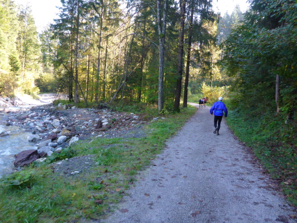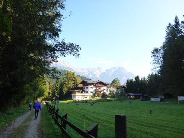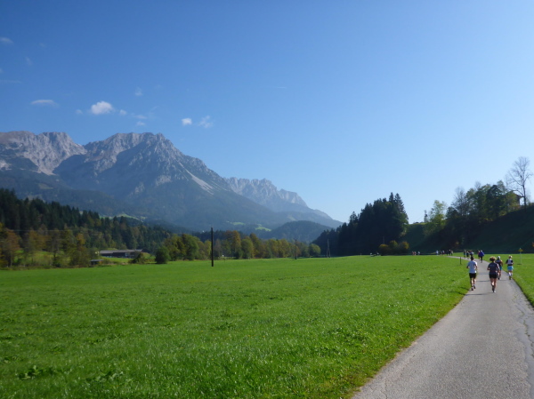 Da die B 178 oder Loferer Straße die Verbindungsstraße zwischen Wörgl und St. Johann und weiter über das Kleine Deutsche Eck nach Salzburg ist, herrscht hier fast immer Stau. Wir Läufer sind nun eindeutig im Vorteil. Schadenfroh winke ich den Autofahrern zu. Der Fahrer eines großen Traktors fragt, ob er mich mitnehmen soll. Nein, nein ich will ja zügig vorwärts kommen. Da die Straße eine größere Kurve macht, haben wir kurz Ruhe vor dem Verkehr. Dann ist der nervige Fahrweg wieder da. Gerade kommt auch noch der Traktor von vorhin. Er ruft mir ein kurzes „viel Glück“ zu, dann biegt unser Weg endgültig ab. Wir haben die ersten Häuser von Ellmau erreicht. Zwischendurch geht es durch ein Wäldchen am Weißbachgraben entlang.