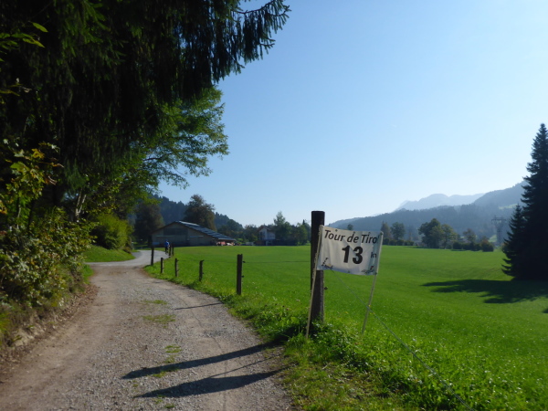Nun geht es tatsächlich auch mal bergab, so dass das km 15 Schild nur so an mir vorbei fliegt. Wir befinden uns an den Liftanlagen Scheffau. Bis hinter Kilometer 17 geht es durch ein locker bebautes Wohngebiet. Dann führt der Radweg direkt an der stark befahrenen B 178 entlang.