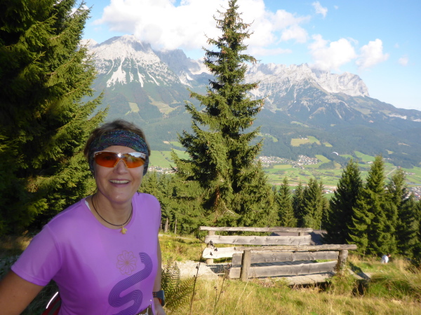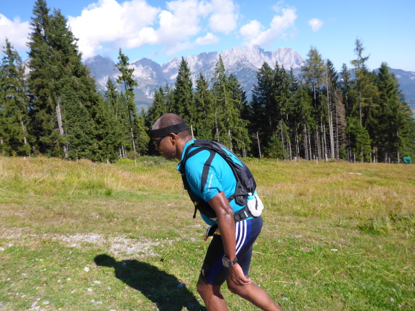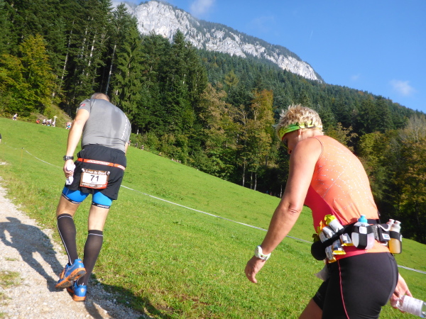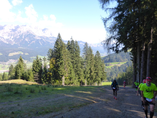 Die Steigung ist jetzt so, dass man eigentlich nicht gehen darf. Ich wechsle immer zwischen Gehen und Laufen. Helfer weisen uns scharf rechts über eine weitere Brücke und den bewaldeten Berg hinauf. Hier gehen nun auch alle und ich muss mich nicht weiter schämen. Bei Kilometer 13 lassen wir das Wäldchen hinter uns. Grüne Weiden soweit das Auge reicht. Von weitem kann man die Häuser von Scheffau erkennen. Die Streckenposten zeigen uns den Weg zur nächsten VP. Hier gibt es zu Wasser und Iso zusätzlich Bananen, Riegel und Gel im Angebot. Mit aufmunternden Worten wird auch nicht gespart.