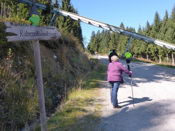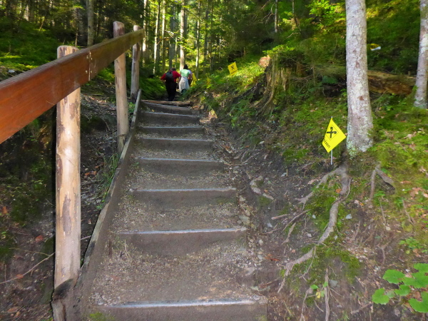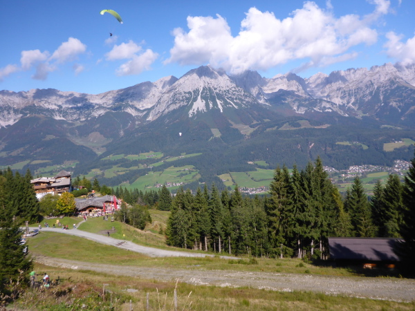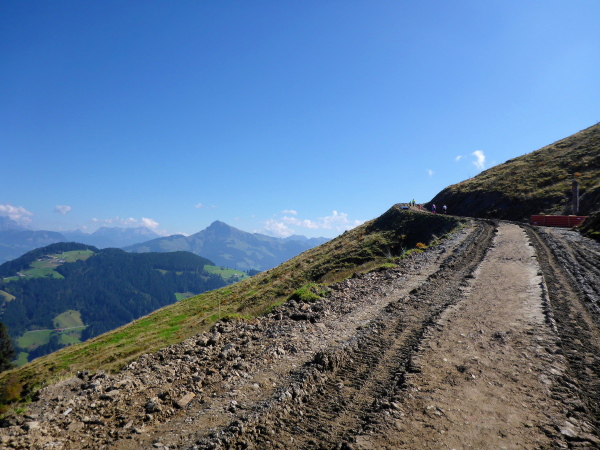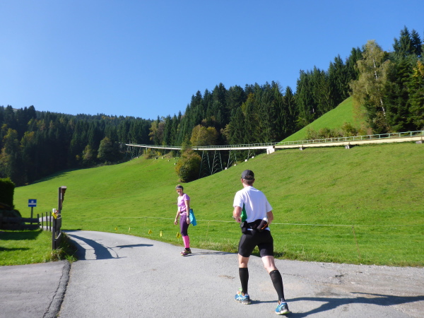 Während ich mich hier aufhalte, kommen weitere Läufer an. Nach reichlicher Stärkung nehmen wir die erste richtige Steigung in Angriff. Der Weg führt an einer grünen Weide hinauf. Gerade versucht ein junger Mann die Schafe von den Kühen zu trennen und weg zu führen. Das scheint wohl schwieriger als gedacht. Zuerst kommen die Schafe nicht mit, dann wollen die Kühe auch noch nach. Das ist lustig anzuschauen. Parallel unseres Weges verläuft die imposante Schienenbrücke der Hartkaiserbahn. Die 1973 fertiggestellte Standseilbahn ist heute einer der wichtigsten Bestandteile der SkiWelt Wilder Kaiser – Brixental. Sie ist 2.300m lang und verbindet die Talstation mit dem 1550 m hohen Gipfel.