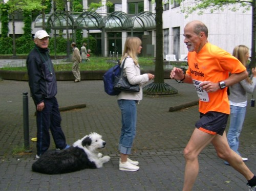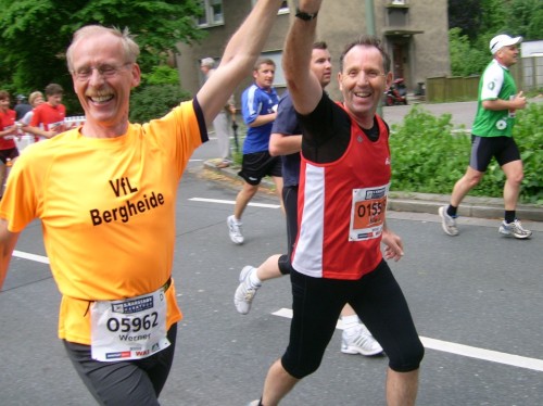 Dann sehe ich plötzlich meinen Vereinsfreund Reinhard Schlutius 50 Meter vor mir auftauchen. Den hatte ich schon längst im Ziel vermutet. Nichts ist mit Zieleinlauf genießen. Ich setzte nochmals zu einem richtigen Endspurt an und kann ihn tatsächlich noch vor dem Ziel einholen. Gemeinsam laufen wir über die Ziellinie. Durch die bessere Nettozeit werde ich sogar vor ihm gewertet.