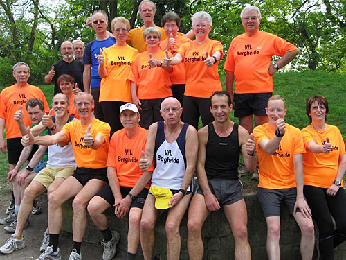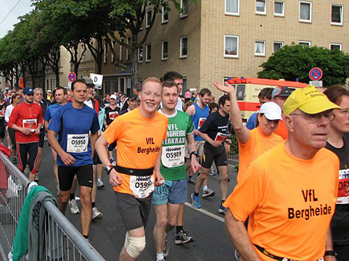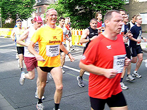 Nun ging es mit 12 Vereinsfreunden also an den Start in Oberhausen. Hatte es am Vortag noch immer wieder heftige Regenschauer mit Windböen gegeben, war es heute doch trocken und mit 15 Grad ganz angenehm. Wir konnten den Kundenparkplatz von Reinhards Apotheke nutzten und brauchten nur noch 400 Meter zum Start laufen. Unterwegs wurden wir von einer Gruppe Afrikaner überholt. Leichtfüßig und konzentriert liefen sie vorbei. Unter ihnen ist auch Moses Masai, der Sieger von 2005 (stieg bei Kilometer 26 aus). Wir wünschten ihnen viel Glück, denn sie würden heute um den Sieg laufen.