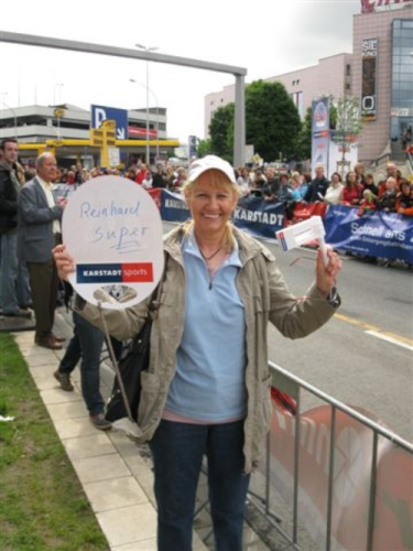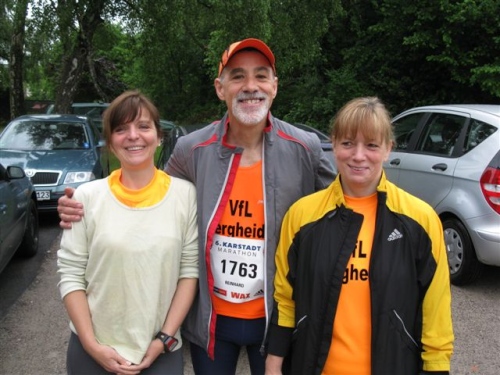 Ich treffe meinen Vereinsfreund Werner. Leider kann er verletzungsbedingt heute nicht starten, doch er will hier den Start beobachten und sich später den Zieleinlauf anschauen. Auch sonst sind fast alle Bergheider Lauffans hier, um uns moralisch zu unterstützen. Von unserem Lauftreff will heute Sabine ihren ersten Marathonlauf wagen. Sie hat sich mit Monika eine erfahrene Marathon- und Ultraläuferin zur Unterstützung besorgt.