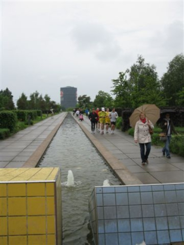 Gut, dass der Regen inzwischen nachgelassen hat. Weiter geht es an dem Revierpark Nienhausen vorbei, und in Essen sehen wir mit der Zeche Zollverein ein von der UNESCO ausgezeichnetes Weltkulturerbedenkmal. Essen muss wohl auch auf sieben Hügeln erbaut worden sein, denn trotz des geänderten Streckenverlaufes sind immer noch etliche Steigungen übriggeblieben. Oder kommt uns das nun auf den letzten Kilometern nur so vor? Zum Glück treffe ich hier Petra von meinem Essener Verein. Sie läuft ein Stück mit mir und lenkt mich so von meinen schweren Beinen wieder ab.