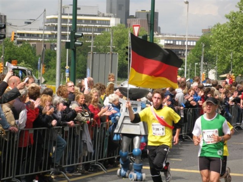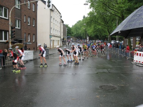 Zuerst sollen dann über 750 Inliner um 10:20 Uhr starten, doch bereits deren Start verzögert sich um eine halbe Stunde. In der Nacht sind wohl einige Absperrgitter verschwunden und die Strecke wird von der Polizei nicht freigegeben. In Dortmund muss man sogar noch länger mit dem Start warten. Die Inliner tragen hier heute ihre NRW Meisterschaften aus. Wir schauen uns ihren Start an. Vorne sind die Profis mit ihrer Hightechausstattung und fahren bereits im Windschatten. Danach wird es immer gemütlicher und die Kostümierung lustiger, also so ähnlich wie bei uns Läufern.