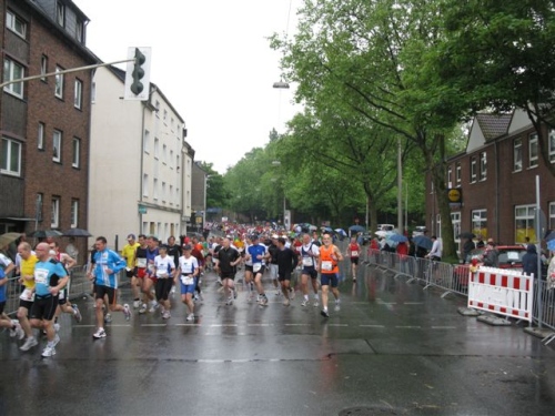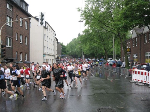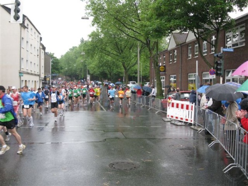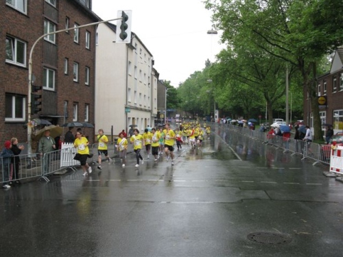 Weiter geht es über breite Straßen Richtung Gladbeck. Das Feld hat sich jetzt eingerollt und die hektischen Überholversuche nehmen ab. Immer wieder werden Läufer vom Zuschauerrand angerufen und begrüßt. Auch im Feld wird gescherzt und gelacht.