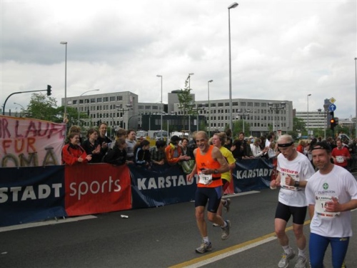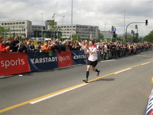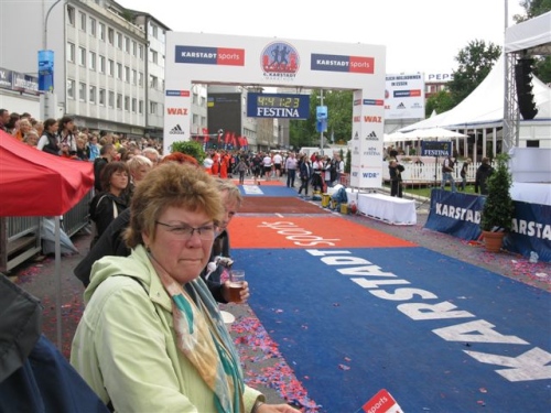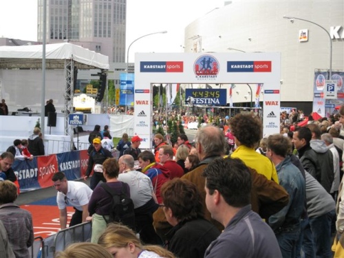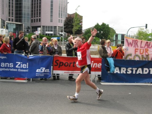 Die Zuschauer werden immer mehr und machen sich mit fast südländischer Begeisterung lautstark bemerkbar. Das motiviert für den Endspurt. Bei Kilometer 40 versorge ich mich nochmals gründlich und genieße dann den langen schönen Zieleinlauf. Hier scheint sich wirklich das halbe Revier versammelt zu haben um alle Läufer zu feiern. Da braucht man sich wirklich nicht hinter Düsseldorf oder Köln zu verstecken.
