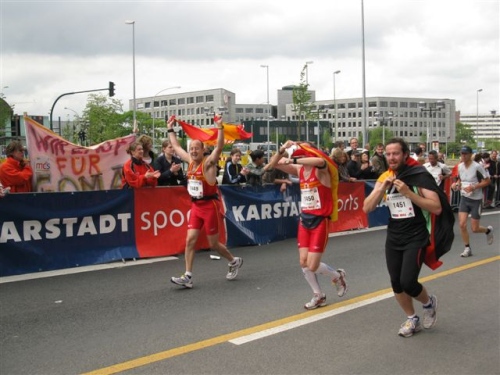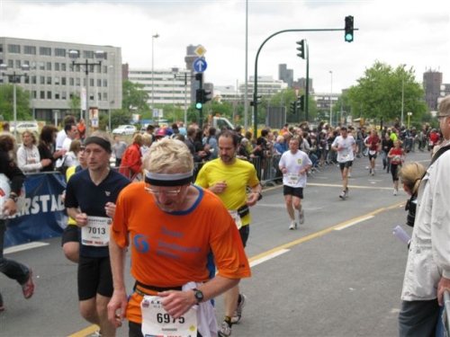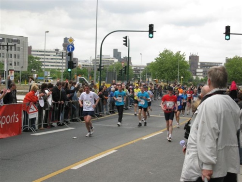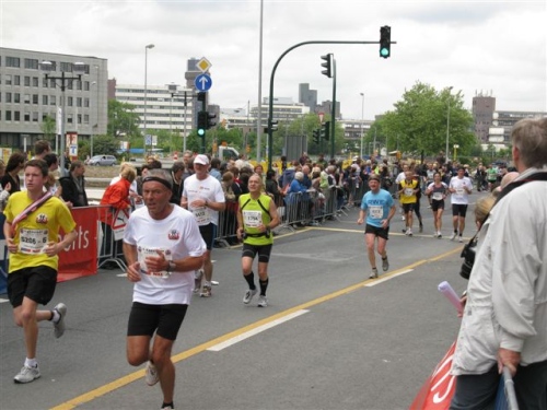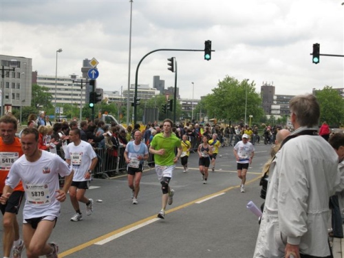 Die Strecke ist jetzt etwas trist geworden und ständig müssen Eisenbahn- und Autobahnbrücken überquert werden. Auch die Zuschauer sind weniger geworden, aber bevor ich in Trance falle höre ich schon wieder Musik und Beifall. Kurz hinter Kilometer 30 treffen sich nämlich die West- und Oststrecke und wir laufen nun den Rest der Strecke gemeinsam. Hier herrscht nochmals Partystimmung, denn das Zusammentreffen der Strecken wollen doch viele Zuschauer beobachten.