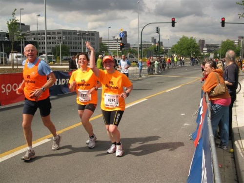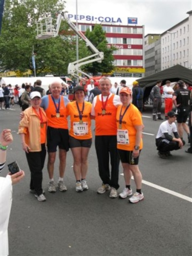 Gemeinsam warten wir noch auf Sabine und Monika. Die kommen dann auch bald zusammen ins Ziel und Sabine ist überglücklich ihren ersten Marathonlauf erfolgreich bewältigt zu haben.