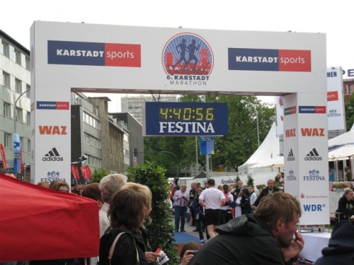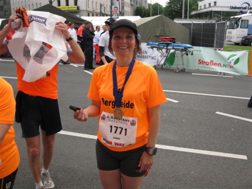 Dann taucht mit dem Limbecker Platz das Ziel auf. In der Menge erkenne ich meine Frau mit Inge und Werner und winke ihnen glücklich zu. Nach 4:11:58 passiere ich die Ziellinie. Ein Mädchen überreicht mir eine schöne Medaille und die Zielverpflegung ist wirklich gut und kann ausgiebig genutzt werden.