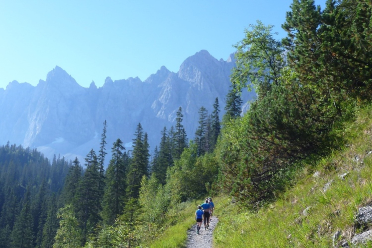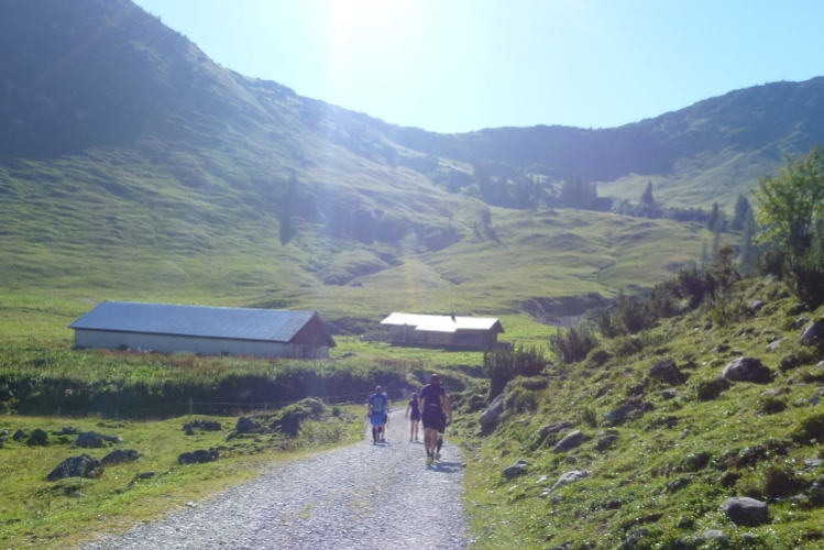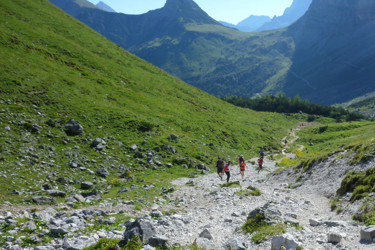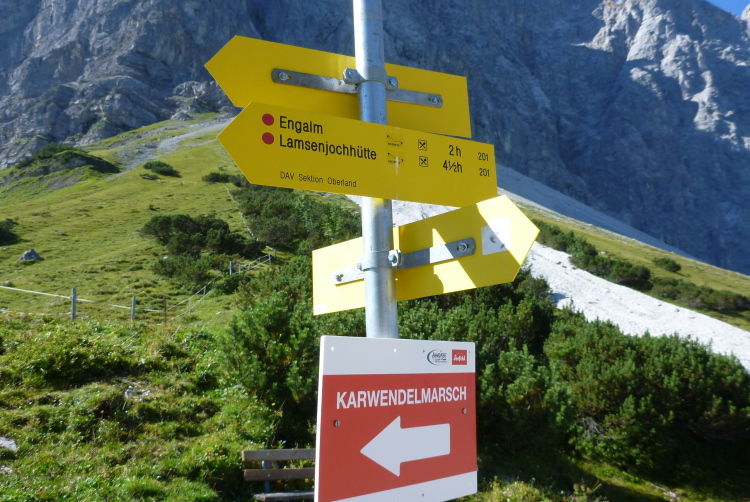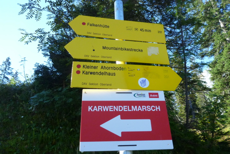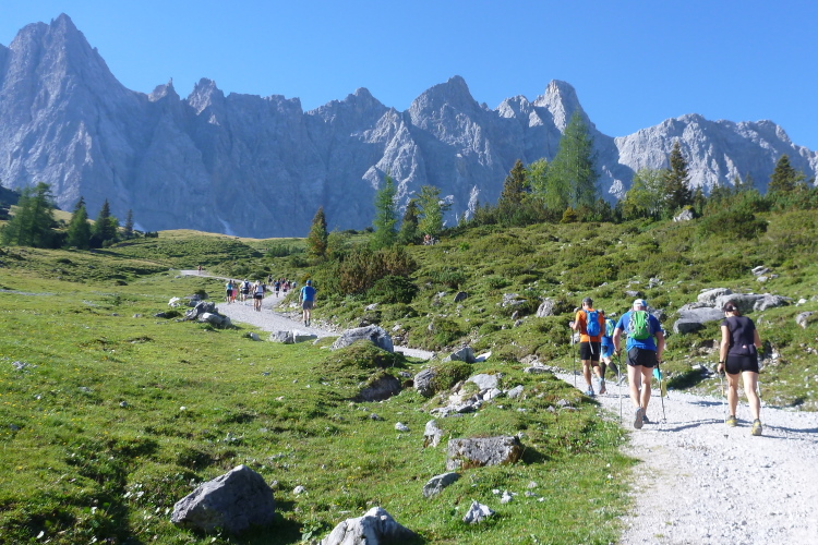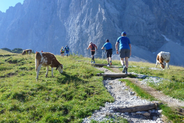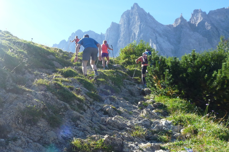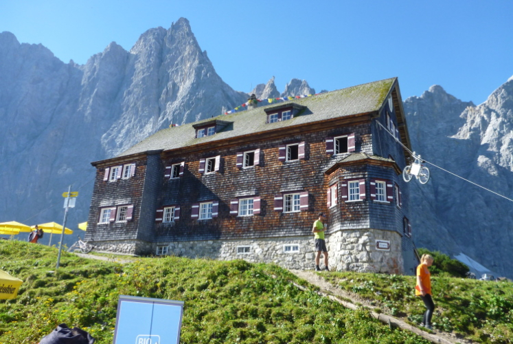 Leider muss ich mich von diesem Anblick schon bald wieder loseisen, ein schwierig zu durchquerendes Geröllfeld ist die nächste Herausforderung. Grober Schotter auf mal schmaleren, mal breiteren Wegen bildet den weiteren Untergrund. Und wieder müssen wir hoch hinaus, die anfänglichen vielstimmigen Gespräche sind mittlerweile vollständig verstummt, jeder ist mit sich alleine ausreichend beschäftigt. Immer schwieriger wird der Untergrund, von einem Weg kann schon lange nicht mehr gesprochen werden. Jeder Schritt in den Felsen will wohlüberlegt sein, zumindest bei mir. Schwer hoch geht es in praller Sonne zu unserem nächsten Ziel, der Falkenhütte. Zwischen 1921 und 1923 erbaut und seit diesem Jahr unter Denkmalschutz stehend, ist die attraktive Hütte auf 1.848 m bei km 30,23 eine Alpenvereinshütte des Deutschen Alpenvereins direkt nördlich über dem Spielissjoch (1.773 m). Sie befindet sich in der Falkengruppe gegenüber den Nordabstürzen der Laliderer Spitze und zwischen Kleinem und Großem Ahornboden. Insbesondere bei Bergsteigern ist sie wegen ihrer Lage und den umfangreichen Tourenmöglichkeiten hochbeliebt. Auch hier ist die Verpflegung reichlich und alles biologisch produziert.