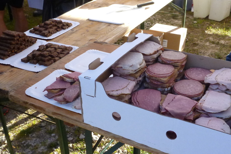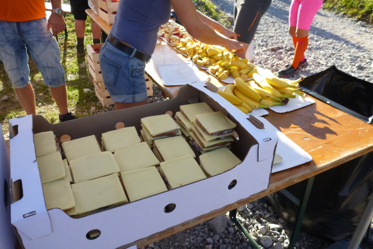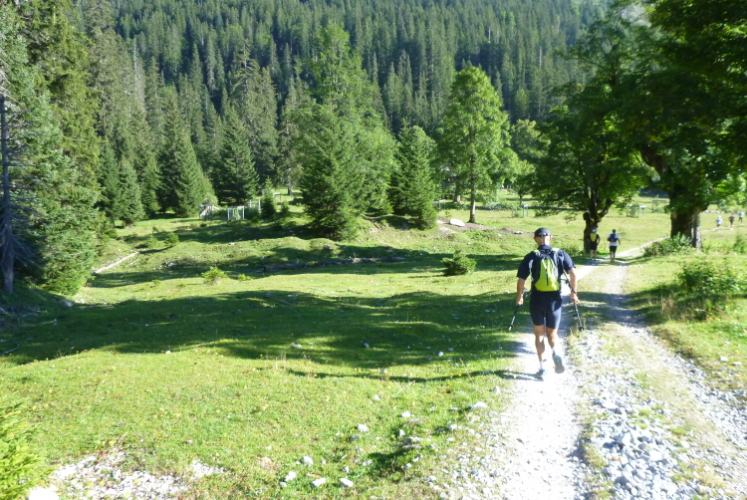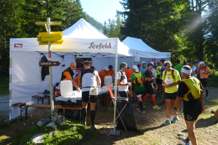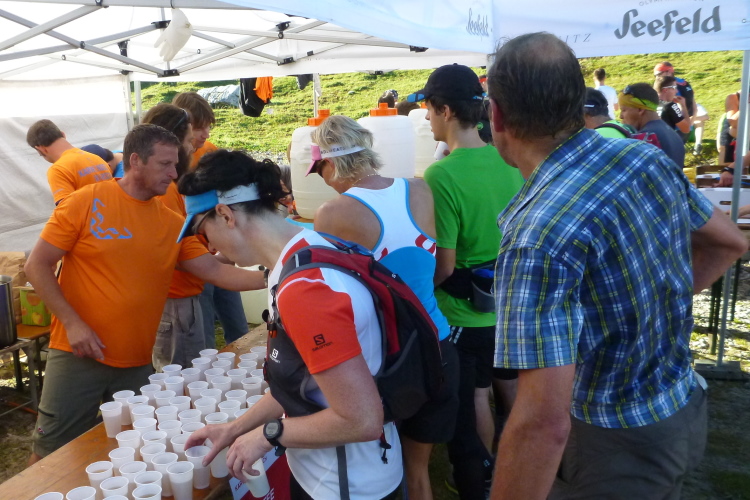 Auf dem Schafstallboden (1.173 m) bei 9,58 km an der Larchetalm bekommen wir dann zum ersten Mal zu essen und trinken, die Schützengilde Scharnitz hat jetzt schon aufgefahren, als hätten wir bereits richtig etwas geleistet. Immer noch flach im Dunst geht es zügig auf gutem Weg voran, mittlerweile hat die Sonne die Hälfte der Berge in ihren Glanz gehüllt. Wir, also zumindest ich, sind froh, dass sie uns noch nicht erreicht, denn was heute temperaturtechnisch auf uns zukommen wird, können wir uns leicht ausmalen. Dann geht’s aufwärts, Klaus packt die Stöcke aus und tut es damit gefühlt der Hälfte der Teilnehmer gleich. Ich werde auf den restlichen knapp 40 km ausreichend Gelegenheit haben, mir für meine Person darüber so meine Gedanken zu machen. Mit Stockeinsatz laufen und dabei ständig die Kamera ein- und auspacken? Bisher habe ich diese bei jedem Lauf immer in der Hand gehalten, allzeit bereit, sozusagen. Mal nachdenken. Der erste von vielen noch folgenden Wasserbottichen steht am Weg, die ersten nutzen ihn bereits zur Abkühlung.