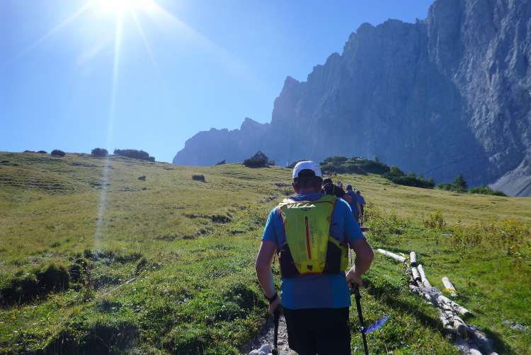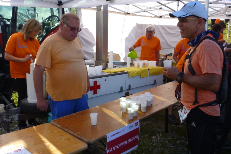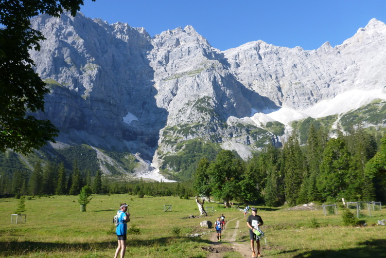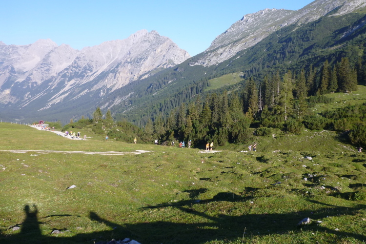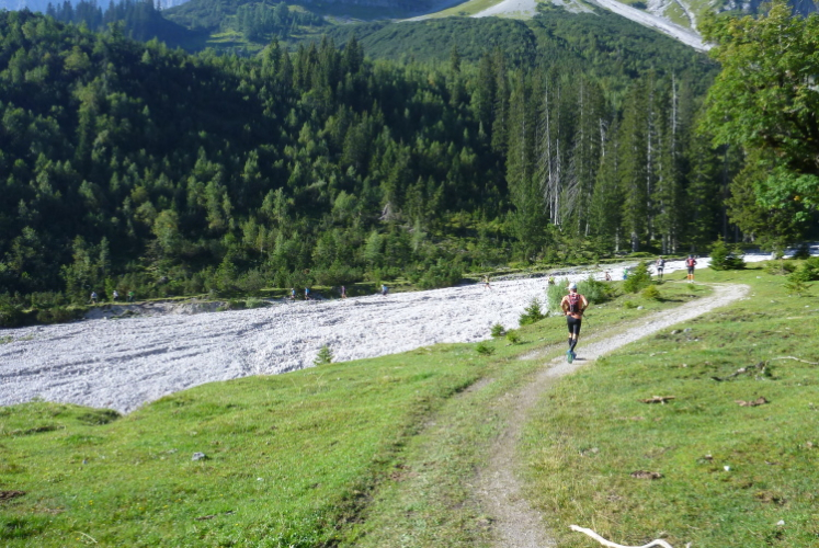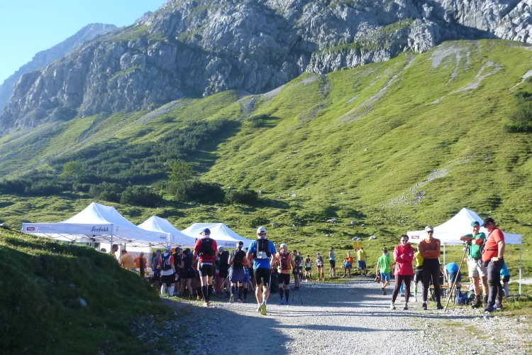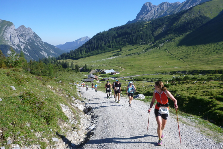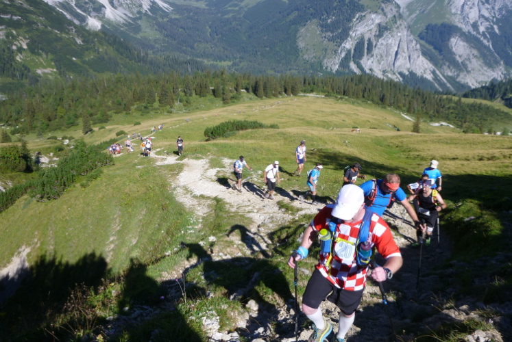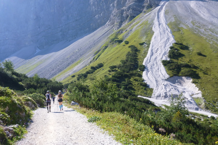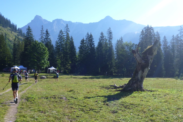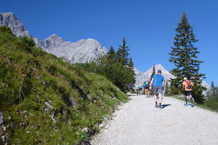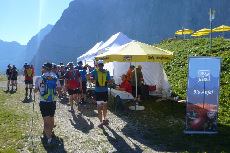 Der erste Rückblick ins Tal, aus dem wir gekommen sind, ist so phantastisch, dass ich die Kamera direkt wieder zücken muss. Auf immer noch ordentlichem Weg, aber bereits deutlich ansteigend, nähern wir uns dem Karwendelhaus (1.771 m) bei 18,19 km, ein Schutzhaus des Deutschen Alpenvereins unweit des Hochalmsattels mit Blick ins tiefer gelegene Karwendeltal. Das 1908 erbaute Karwendelhaus liegt inmitten des Karwendels in Tirol, nicht weit entfernt von der Grenze zu Bayern und wegen der zentralen Lage und den zahlreichen Tourenmöglichkeiten für Bergsteiger ein wichtiger Stützpunkt bei mehrtägigen Wanderungen. A propos Grenze zu Bayern: Vier Fünftel des Karwendels gehört zu Deutschland, unser Lauf führt aber ausschließlich durch Tirol. Heutzutage spielt das Gott sei Dank ja keine Rolle mehr. Eine Rolle spielt ab sofort die Sonne, die uns nach exakt 17 km zum ersten Mal voll im Griff hat. Höhepunkt der hiesigen Verpflegung ist die in Trinkbechern ausgeschenkte Kartoffelsuppe, in die ich mich hineinlegen könnte, so gut schmeckt sie mir. Die Masse der bereitliegenden Brote mit Käse und mehreren Wurstsorten erschlägt einen allein schon vom Anblick, aber leider kann ich nicht alles probieren. Denn noch warten die meisten Höhenmeter des Karwendelgebirges auf mich und so viel will ich auch nicht hinaufschleppen.