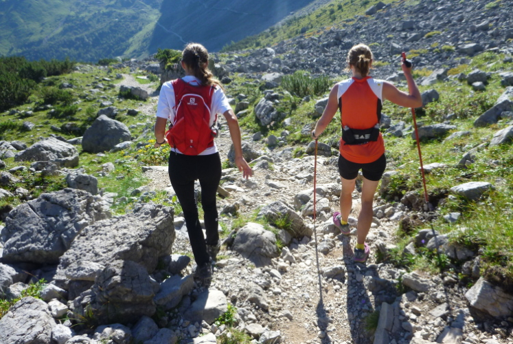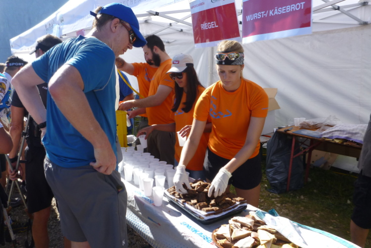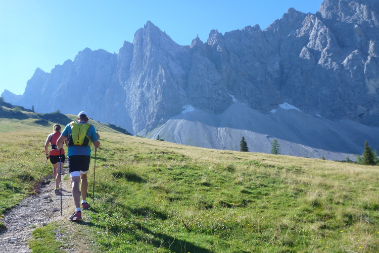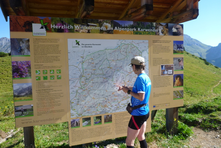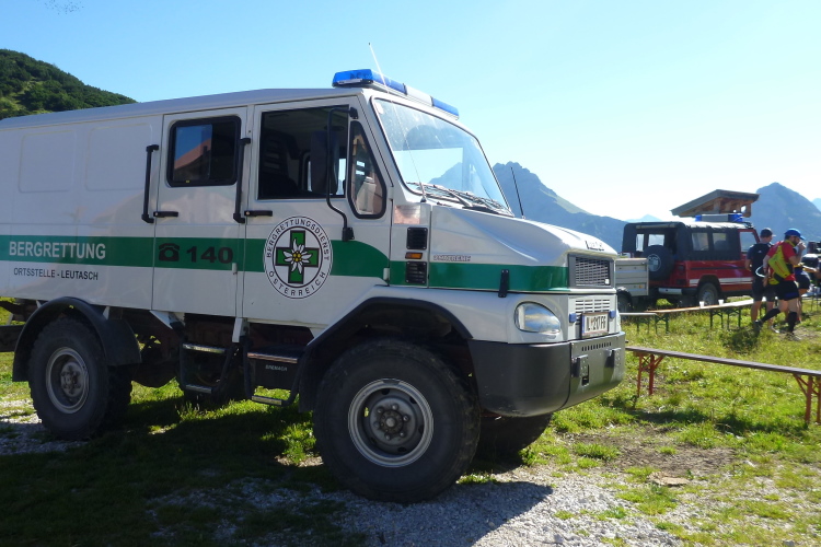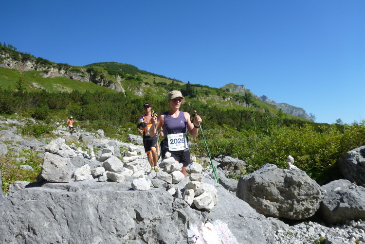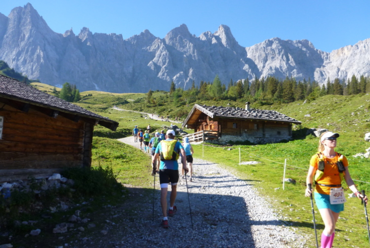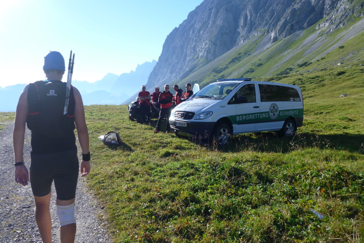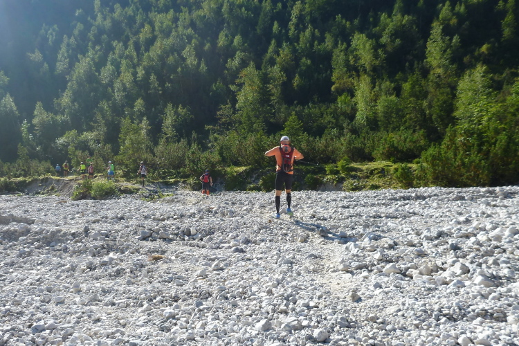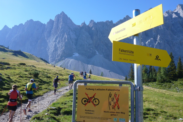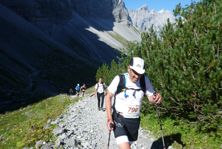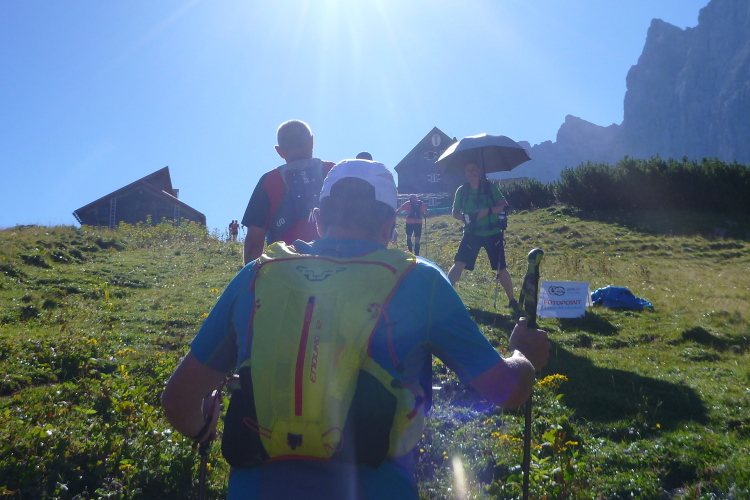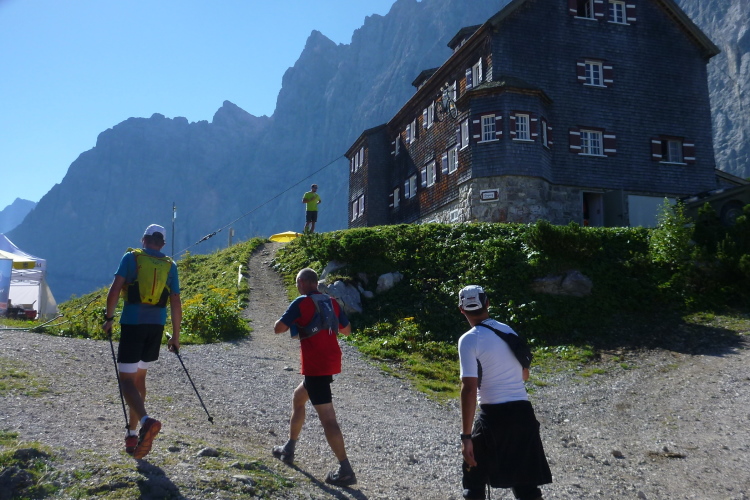 Der erste Rückblick ins Tal, aus dem wir gekommen sind, ist so phantastisch, dass ich die Kamera direkt wieder zücken muss. Auf immer noch ordentlichem Weg, aber bereits deutlich ansteigend, nähern wir uns dem Karwendelhaus (1.771 m) bei 18,19 km, ein Schutzhaus des Deutschen Alpenvereins unweit des Hochalmsattels mit Blick ins tiefer gelegene Karwendeltal. Das 1908 erbaute Karwendelhaus liegt inmitten des Karwendels in Tirol, nicht weit entfernt von der Grenze zu Bayern und wegen der zentralen Lage und den zahlreichen Tourenmöglichkeiten für Bergsteiger ein wichtiger Stützpunkt bei mehrtägigen Wanderungen. A propos Grenze zu Bayern: Vier Fünftel des Karwendels gehört zu Deutschland, unser Lauf führt aber ausschließlich durch Tirol. Heutzutage spielt das Gott sei Dank ja keine Rolle mehr. Eine Rolle spielt ab sofort die Sonne, die uns nach exakt 17 km zum ersten Mal voll im Griff hat. Höhepunkt der hiesigen Verpflegung ist die in Trinkbechern ausgeschenkte Kartoffelsuppe, in die ich mich hineinlegen könnte, so gut schmeckt sie mir. Die Masse der bereitliegenden Brote mit Käse und mehreren Wurstsorten erschlägt einen allein schon vom Anblick, aber leider kann ich nicht alles probieren. Denn noch warten die meisten Höhenmeter des Karwendelgebirges auf mich und so viel will ich auch nicht hinaufschleppen.