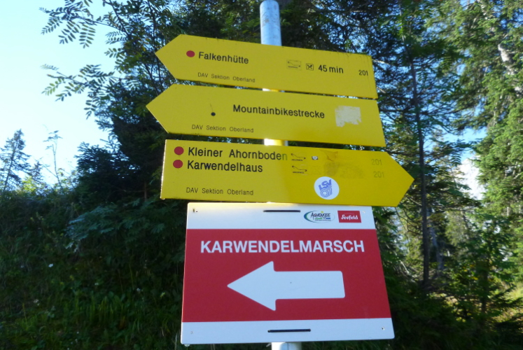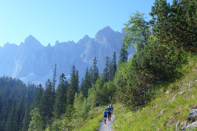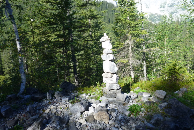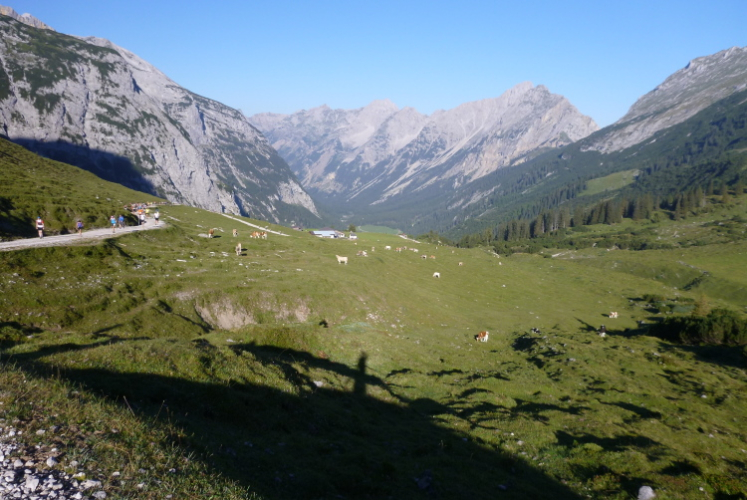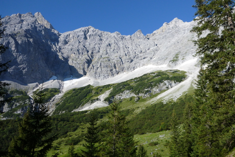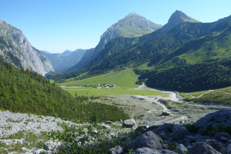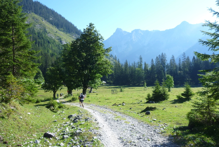 Weiter führt der Weg bergan. Gegen 1550 begannen im Karwendel die ersten großflächigen Rodungen zur Schaffung von Almen, einige Zeugnisse sind heute noch erhalten: So ist der große Ahornboden, dessen kleinen Bruder wir bald besichtigen werden, entgegen der landläufigen Meinung ein künstlich geschaffener Ort. Darüber hinaus zwang der Beginn des 30jährigen Krieges viele Bauern dazu, mit ihrem Vieh zum Schutz vor Plünderungen in abgelegene Gebiete abzuwandern. Heute findet man diese Gebiete z.B. unterhalb der Talelespitze, in der Faulen Eng oder am Plumsjoch. Im Rahmen der Rodungen wurde auch das erste Mal die Holzdrift auf der Isar praktiziert. Bis Mitte des 20. Jahrhunderts wurde so das Holz aus den Karwendeltälern nach Scharnitz und Mittenwald geschafft. Experten können die Folgen der langandauernden Übernutzung heute noch ausmachen.