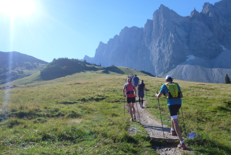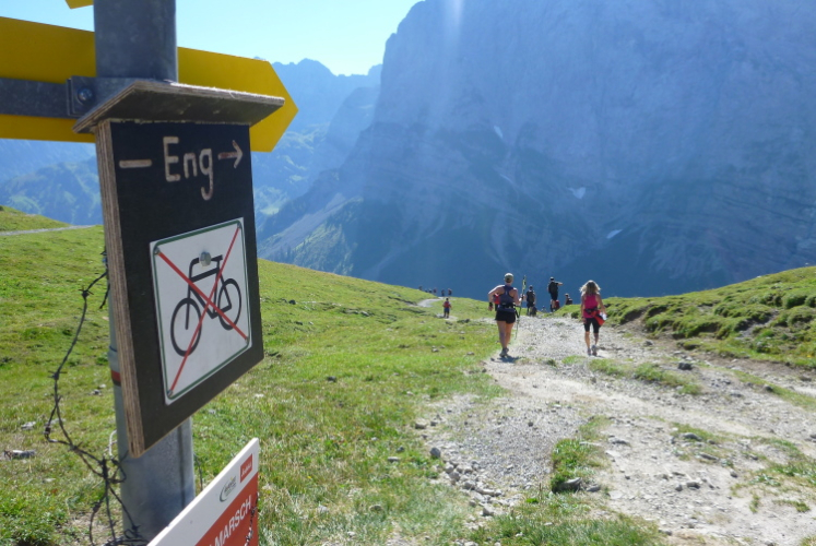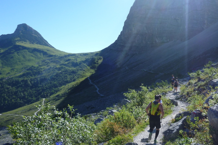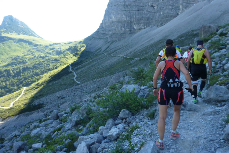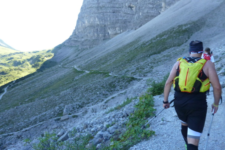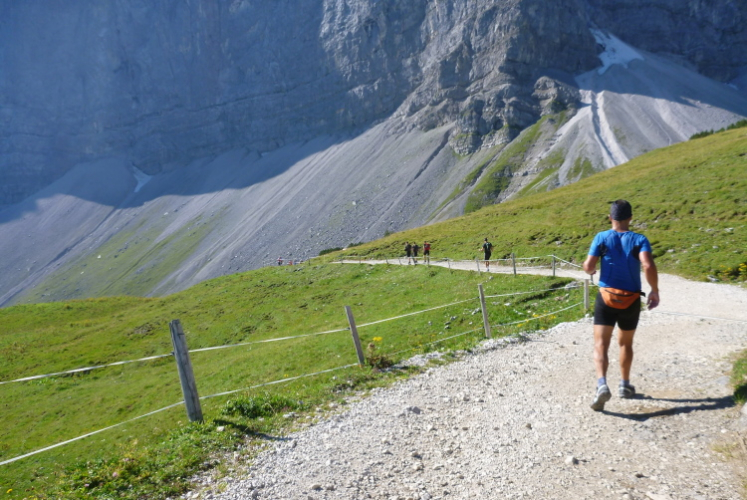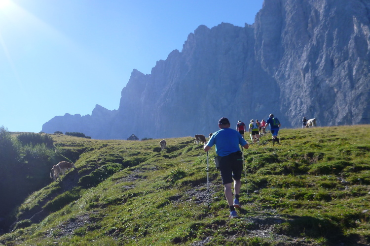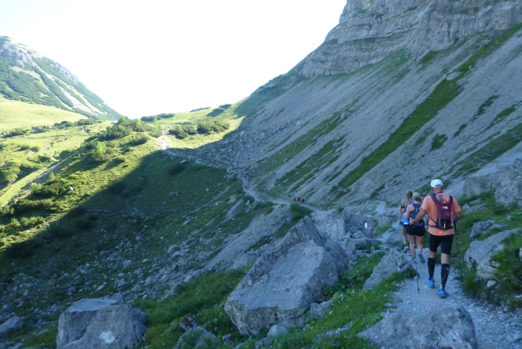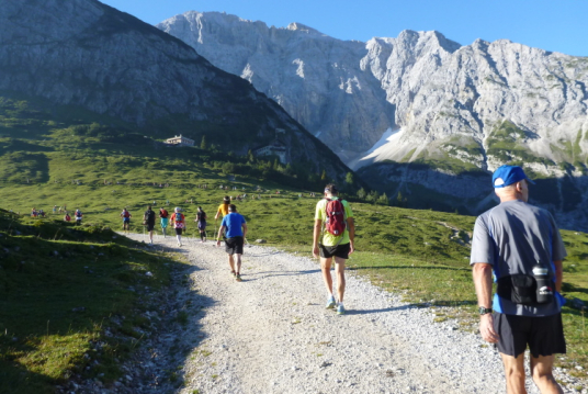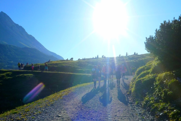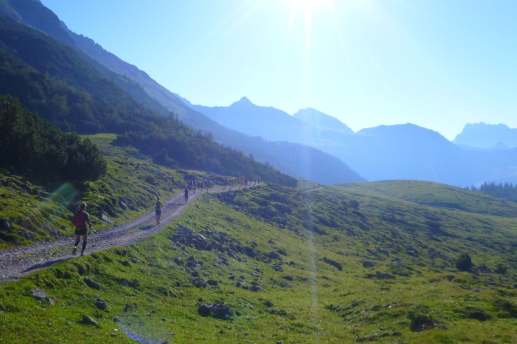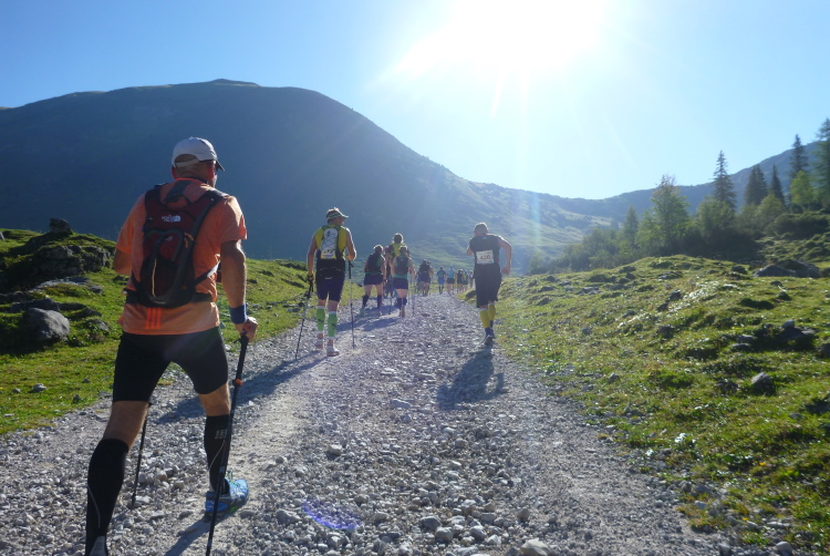 Mittlerweile ist es hell geworden und wir können, noch fast vollständig im Flachen, die morgendliche Bergwelt bewundern. Gut zu belaufen ist der geschotterte Weg, die Gespräche sind nett und die Welt ist schön. Noch. Au Backe. Gut, dass ich noch keine Ahnung von dem habe, was mich insbesondere auf der zweiten Hälfte erwarten wird. Dann erfolgt ein grandioses Naturschauspiel, denn die ersten Sonnenstrahlen bescheinen einige Bergspitzen. Das hat wirklich etwas von „Im Frühtau zu Berge wir zieh'n...“ Einfach herrlich. Dann, kurz vor der ersten Labestation, wie die Ösis zu sagen pflegen, ein Bild für die Götter: Vor uns steht der Dunst in den Wiesen wie ein weicher Watteteppich, gleich reihenweise bleiben die Leute stehen und versuchen dies mit iPhone & Co. einzufangen und für die Ewigkeit zu bewahren. Wunderschön.