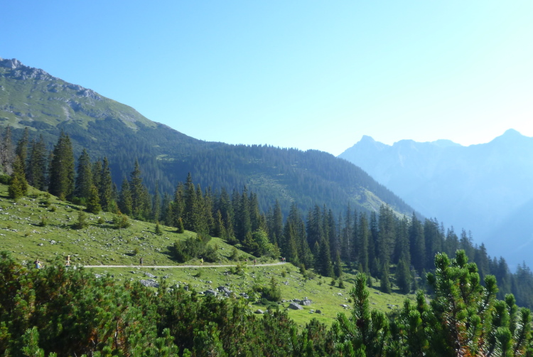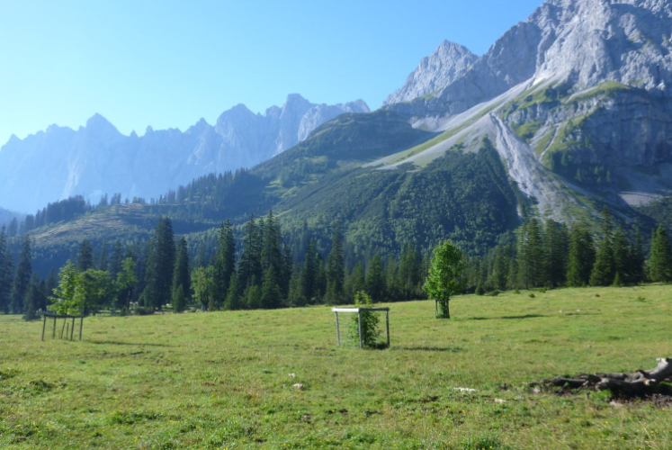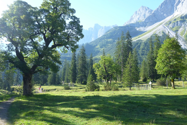 Über Serpentinen geht es dann bergab zum kleinen Ahornboden auf 1.399 m. Er befindet sich bei km 24,23 am südlichen Ende des Johannestals direkt unterhalb der steil abfallenden Nordwände der Hinterautal-Vomper-Kette und beherbergt, wie sein großer Bruder, alte Berg-Ahornbestände. Beide zusammen bilden seit 1928 ein tirolerisch-bayrisches Landschafts- und Naturschutzgebiet. Zahlreiche der 300 bis 600 Jahre alten und sehr knorrigen Ahornbäume haben ihre natürliche Altersgrenze erreicht, die Leichen lässt man jedoch stehen, wie mir scheint. Da die natürliche Verjüngung aufgrund veränderter Boden- und Wasserverhältnisse und durch die Beweidung von Vieh und Wild nicht funktioniert, so habe ich gelernt, werden abgestorbene Bäume durch Neupflanzungen ersetzt.