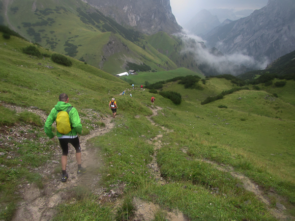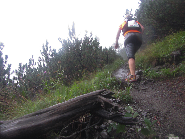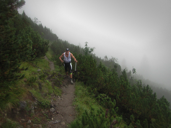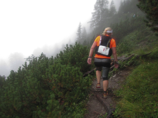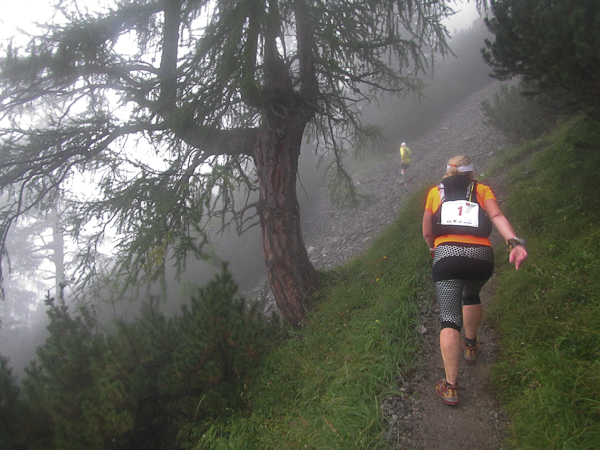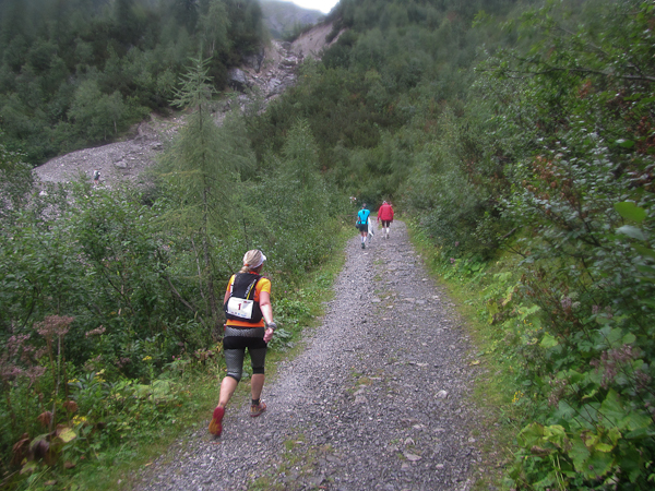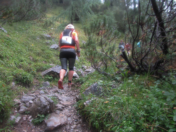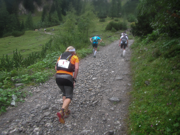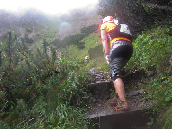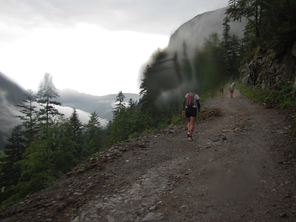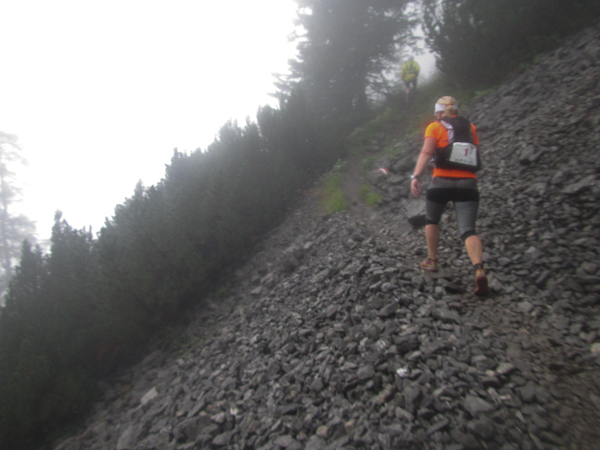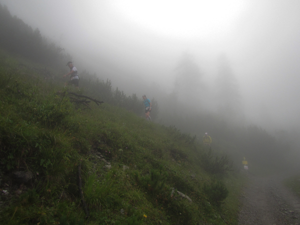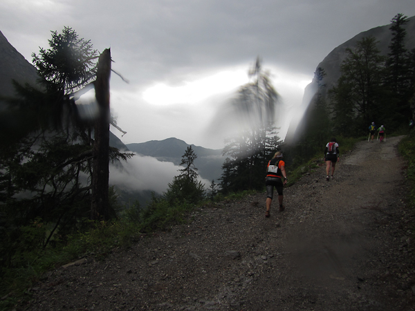 Und als liefen wir in der Pinkelrinne Gottes, so kommt uns das Regenwasser entgegen. Strecken wie diese fordern Geduld und das Vergnügen des Bergablaufens muss man sich erst hart verdienen. Während ich selbstvergessen vor mich hin aufsteige, fotografiert Kay die Läufer.