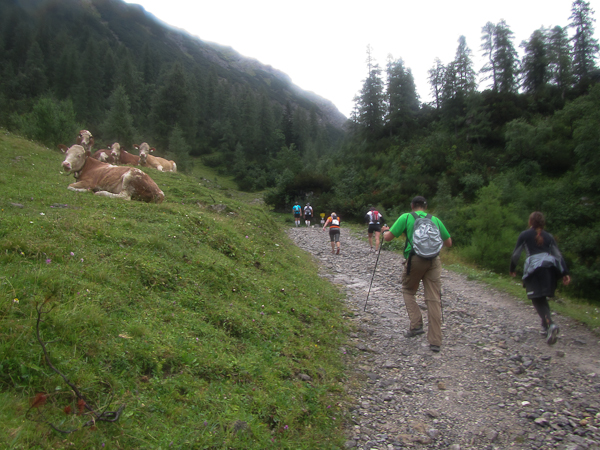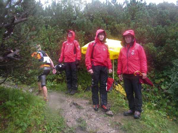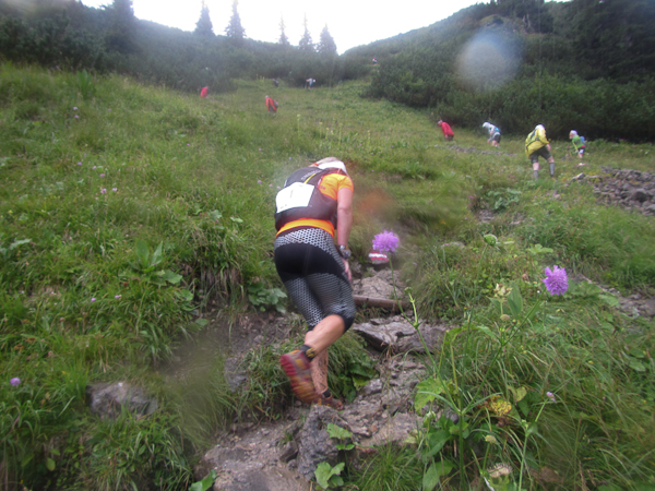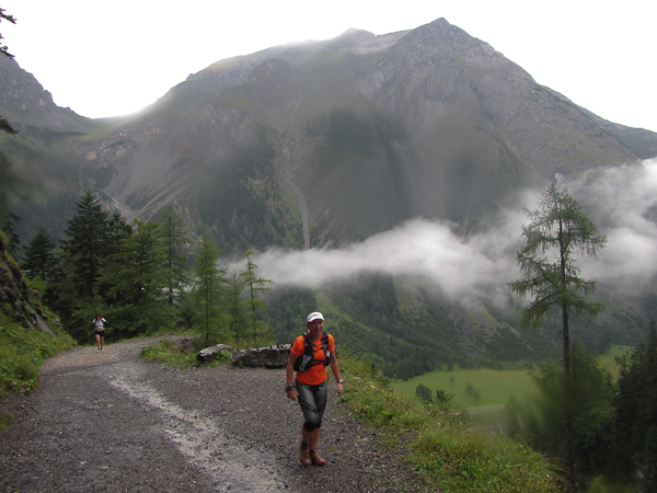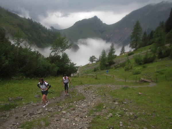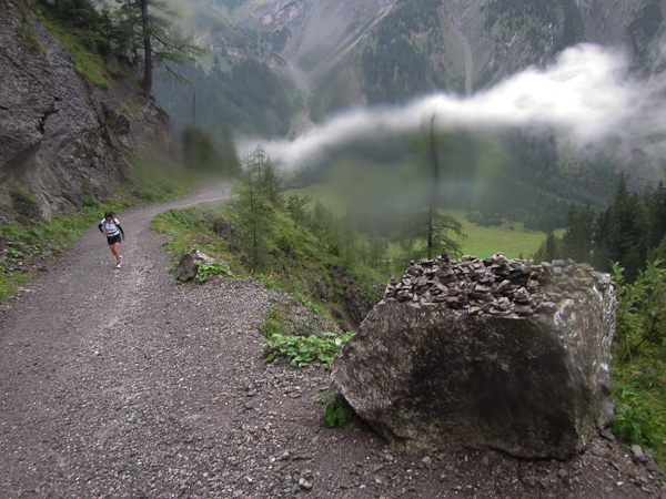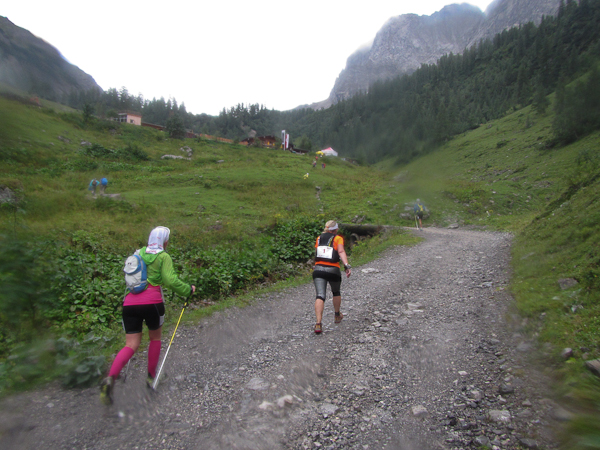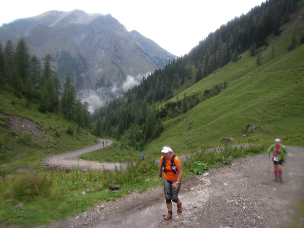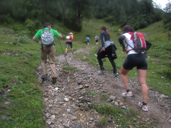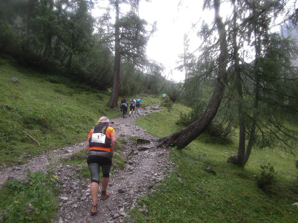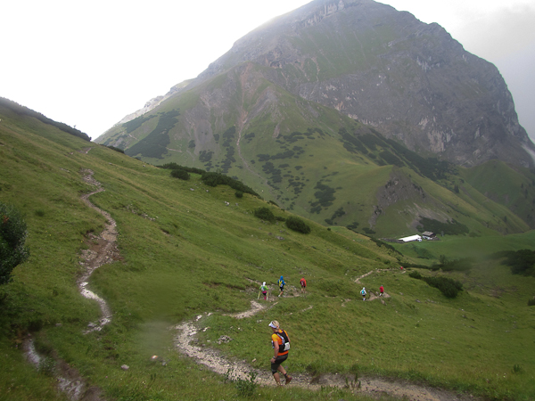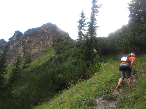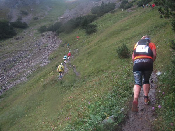 Und als liefen wir in der Pinkelrinne Gottes, so kommt uns das Regenwasser entgegen. Strecken wie diese fordern Geduld und das Vergnügen des Bergablaufens muss man sich erst hart verdienen. Während ich selbstvergessen vor mich hin aufsteige, fotografiert Kay die Läufer.
