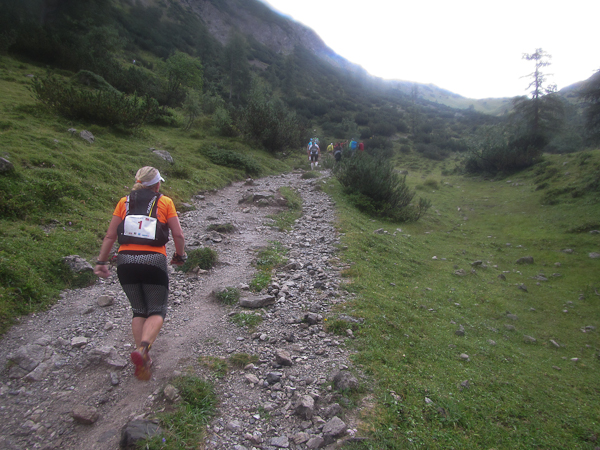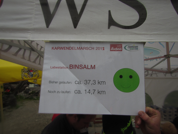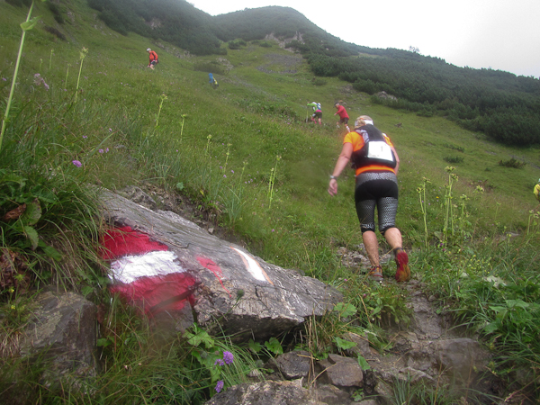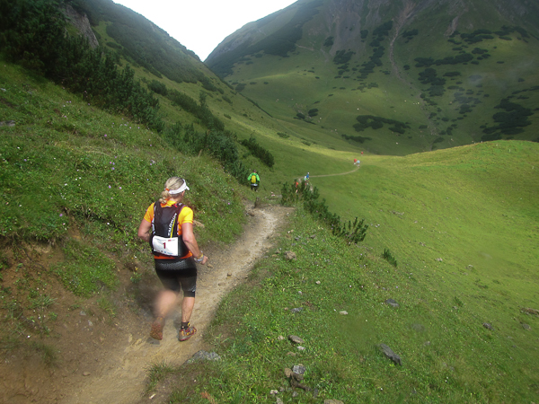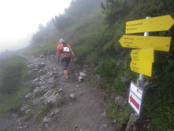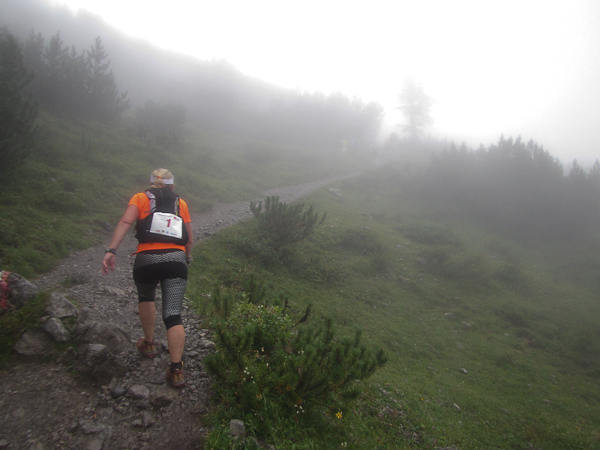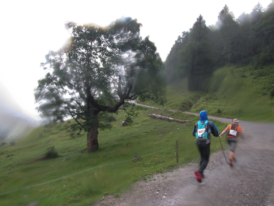Die Buam an dieser Verpflegungsstelle sind besonders gut gelaunt, aber das sind wir nach circa 37 Kilometern auch noch. Wir sind auf 1.502 m ü.M. Sie rufen uns hinterher: „Nur noch 350 Höhenmeter auffi!“ Von da an geht’s nur noch bergab bis ins Ziel. Die „350 Höhenmeter auffi“ haben es in sich. Sehr, sehr mühsam kriecht ein Pfad nach oben, nimmt hier eine Kurve nach links, dort eine nach rechts, schiebt sich ein elend langes Stück den Berg hoch und ist doch noch immer nicht oben angelangt.