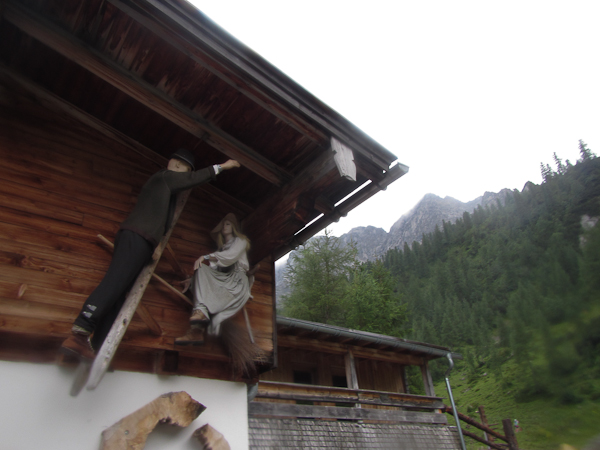 Hier in der Eng gibt es nicht nur die neuen Anbauten, sondern tatsächlich schon seit Jahrhunderten bäuerliche Bewirtschaftung. Jetzt im strömenden Regen sitzt niemand auf der Sonnenterasse und lässt sich die frische Almmilch schmecken. In der Saison werden hier bis zu 550.000 Liter Milch verarbeitet. Kein Wunder, denn hier ist die größte Melkalm des Landes, Butter und der Käse werden vor Ort verarbeitet. Beim Weiterlaufen bekommen wir endlich den ersten Adler zu sehen. Er ist aus Plexiglas und nass vom Regen.