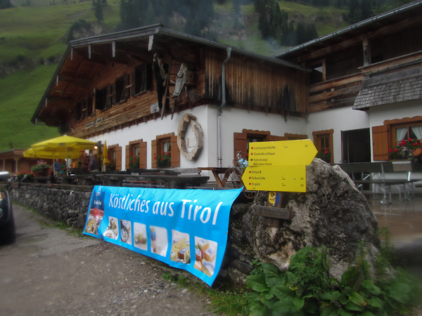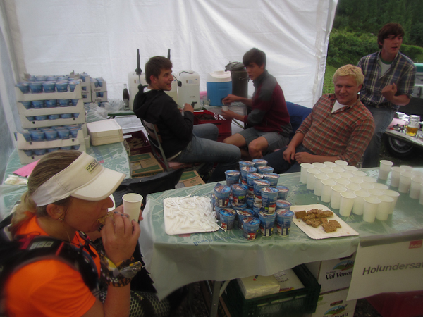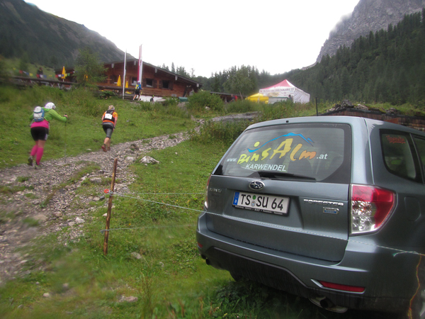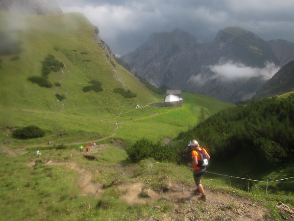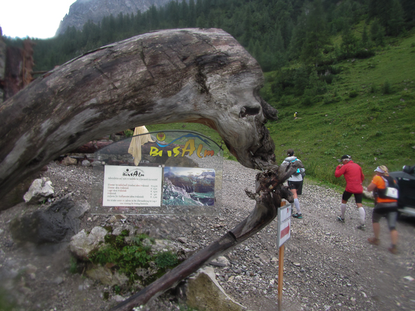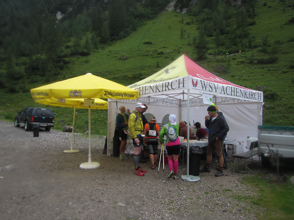 Plötzlich aber, wie aus dem Nichts, vertreibt der Wind die Wolken. Die Sonne strahlt. Wir auch. Die Wärme tut gut, dem Körper und der Seele. Wir sind am Gramai Hochleger auf 1.756 m ü. M. angelangt. Regen tropft von den zusammengefalteten Sonnenschirmen. Es ist leer auf der Sonnenterrasse. „Hoaßnocken“ ein Teig aus Mehl, Salz und Wasser war die tägliche Kost der Holzarbeiter und einfacher wie die, die wir heute an jeder der insgesamt zehn Verpflegungsstellen erhalten. Jedoch ging kein Karwendeltäler Holzarbeiter ohne seinen Schnaps in den Wald. Ich setze mich. Wer kann schon bei einer Auswahl von frischem Bauernbrot belegt mit Schinken, Käse oder Wurst, Gemüse-, Heidelbeer- und Haferflockensuppen, Keksen, Müsliriegel und Obst wiederstehen? Schade, Kay ruft, dass es weitergeht und ich muss meine gerade erst begonnene Schlemmermahlzeit schon wieder beenden. Tatsächlich ist dies unser erster Ultramarathon, bei dem unsere hochkalorischen Powerenergieprodukte im Rucksack bleiben.