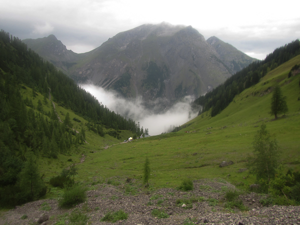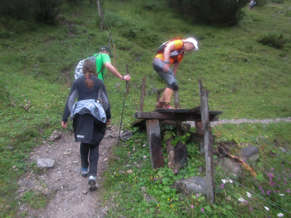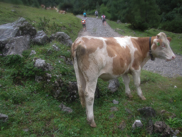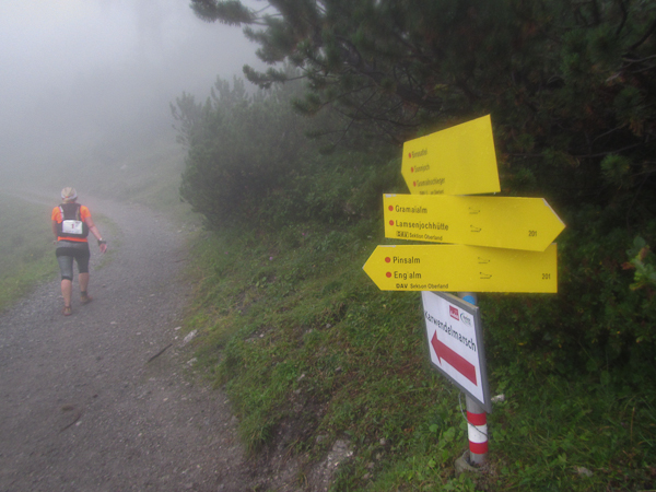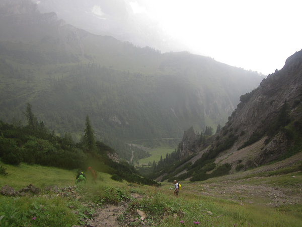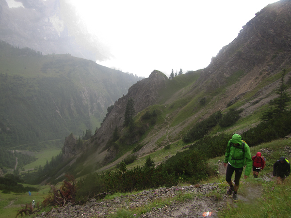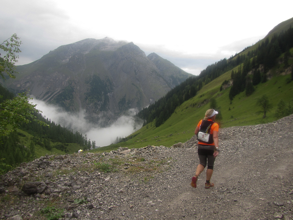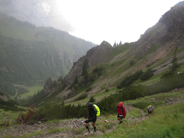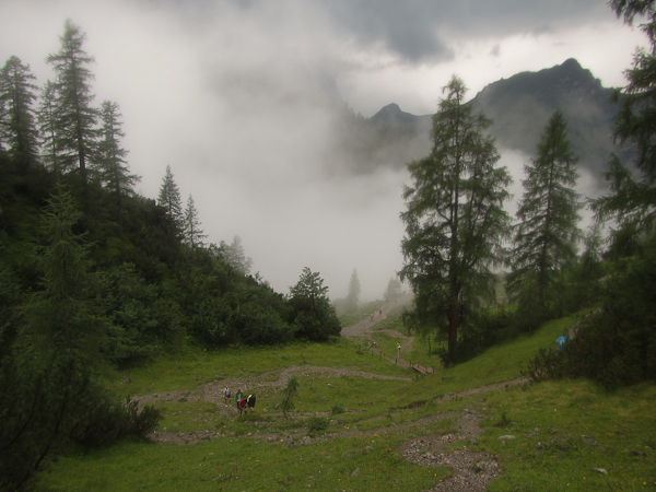 Nun geht es über einem breiten Fahrweg nach oben in Richtung Binsalm. Wo noch vor ein paar Wochen prächtig die Alpenrosen leuchteten, verwandelt der andauernde starke Regen die Staubpiste zwischen den abgeblühten Alpenrosenfeldern zum Schlammpfad. Die hellbraune Erde klebt in dicken Klumpen an meiner rotgelben Sohle.