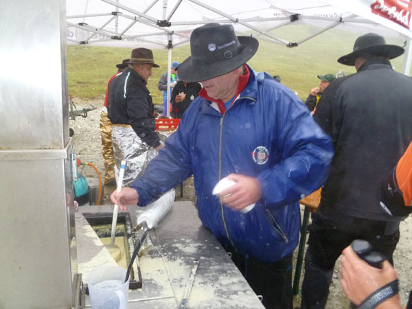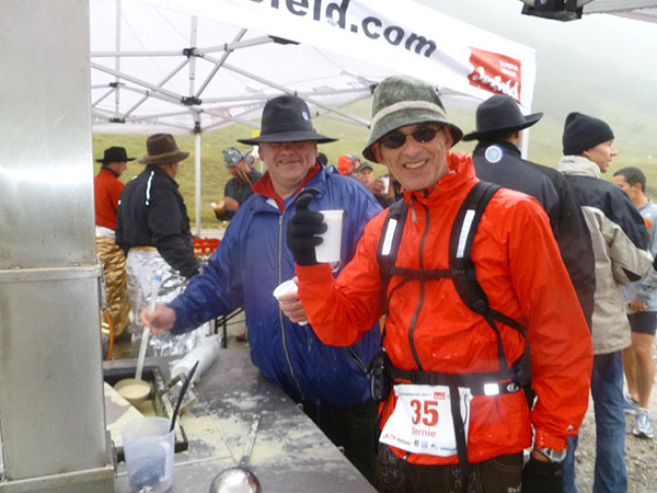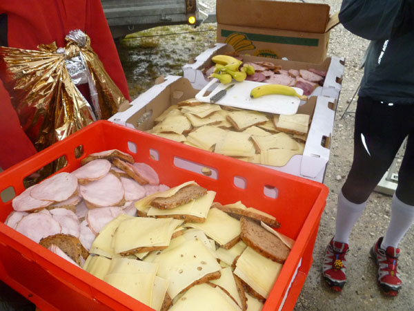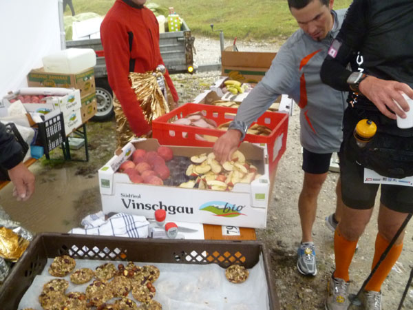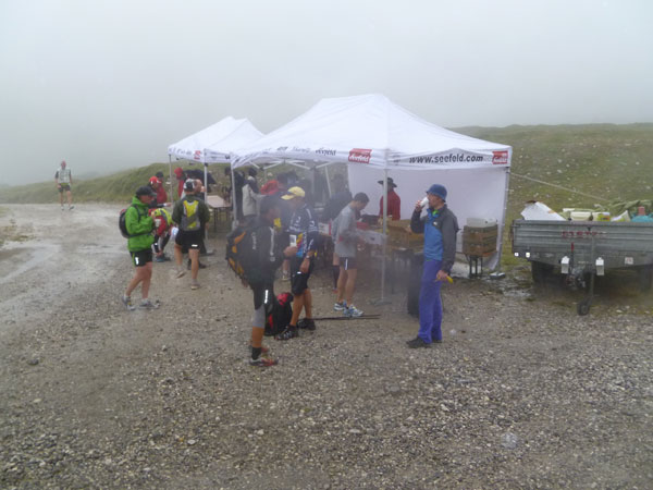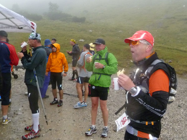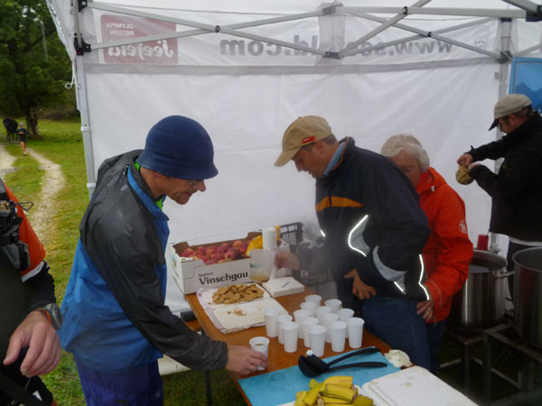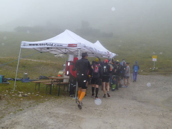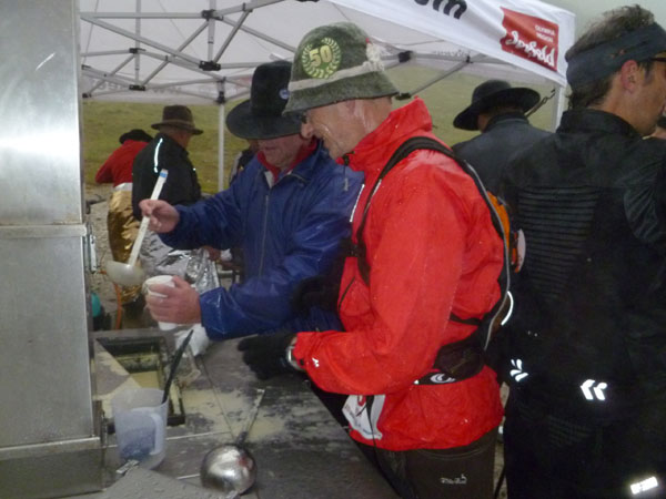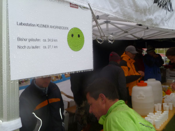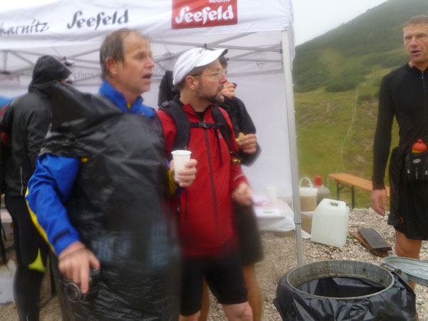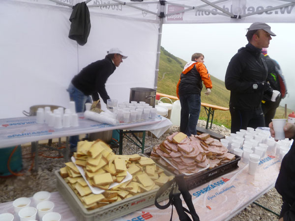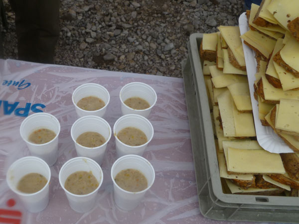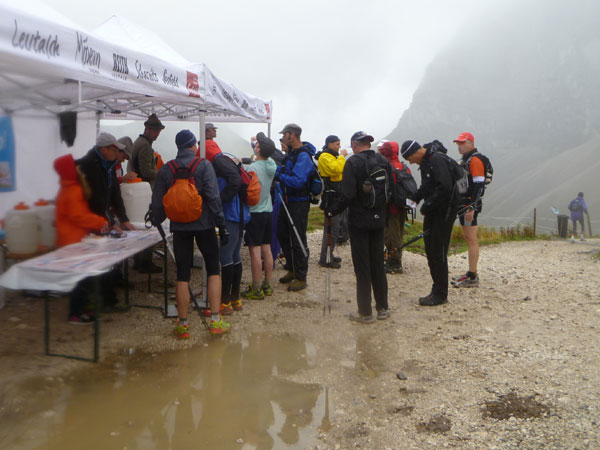 Unterhalb der Falkenhütte können wir uns wieder stärken. Das Verpflegungszelt steht zwar an sehr exponierter Stelle wo es zieht wie Hechtsuppe, aber die Brotzeit ist wieder allererste Sahne. Alles was wir heute an den Stationen serviert bekommen ist ausschließlich BIO. Alle Produkte kommen von Bio-Bauernhöfen aus der Region und wurden teilweise extra für den Karwendelmarsch hergestellt. Im gerade vorliegenden Fall muss ich besonders die extra dicke Hafersuppe löblich erwähnen, ist mal wirklich was anderes wie die pappsüßen Energygels. Die warmen Speisen und Getränke finden bei dem jetzigen Schmuddelwetter nicht nur bei mir am meisten Anklang. Am allerbesten schmecken mir aber die selbstgemachten Riegel. Sie sehen aus wie kleine Florentiner und schmecken beinahe auch so, nur nicht ganz so süß. Am liebsten würde ich mir den Rucksack voll einpacken, sie gibt es aber noch an diversen Stationen zum durchfuttern.