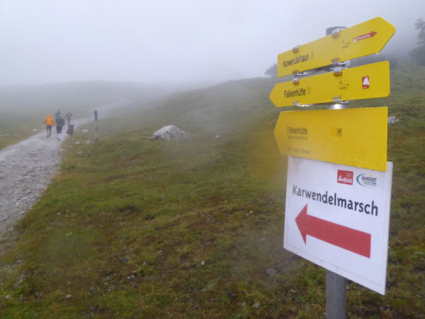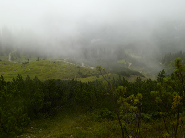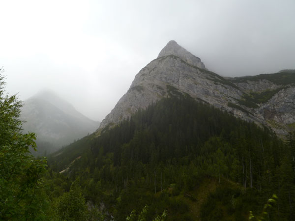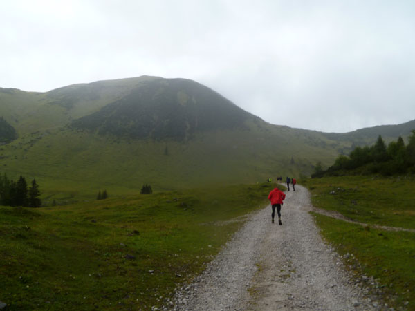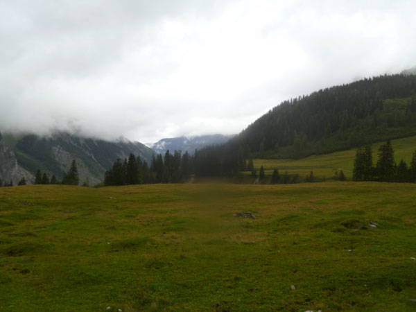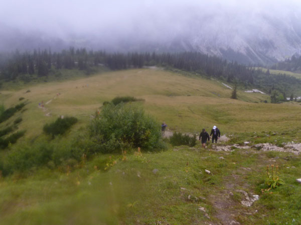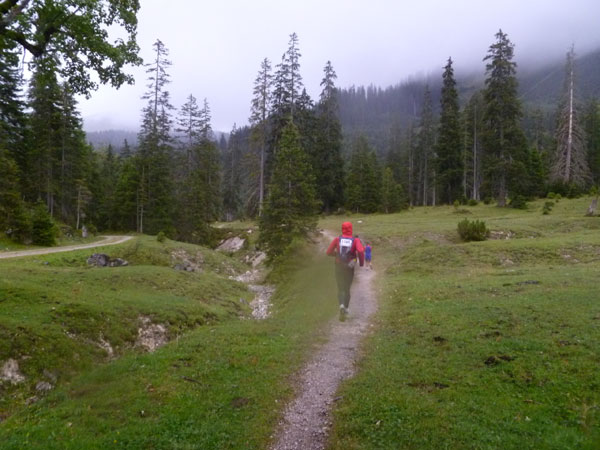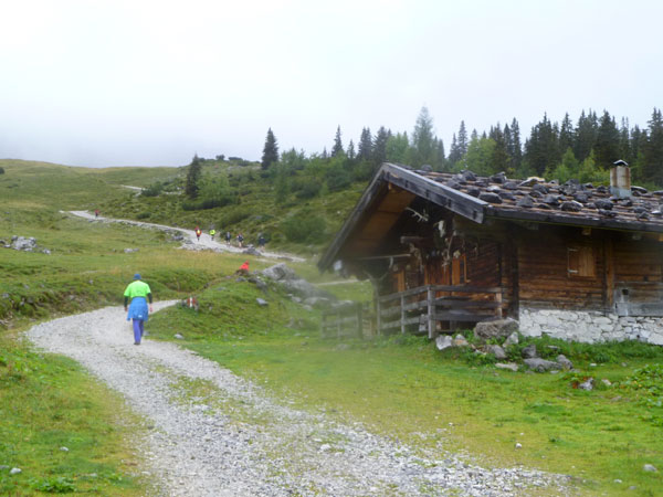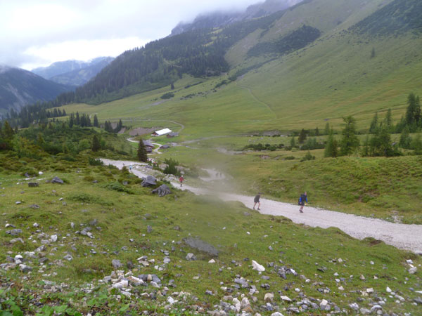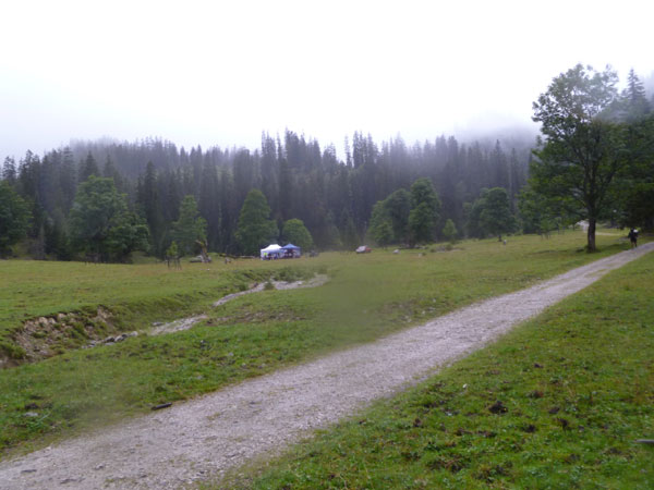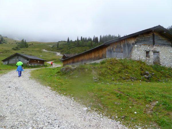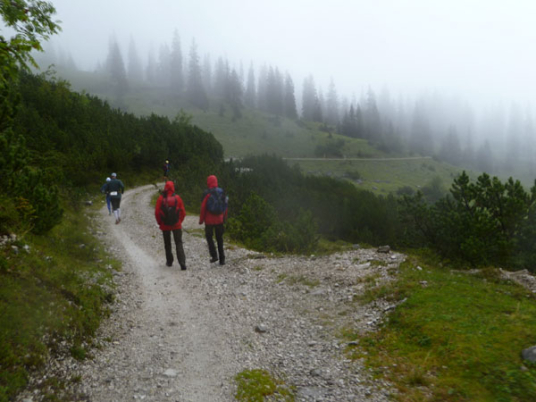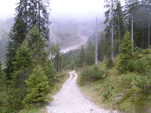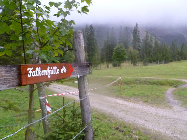 Nach einem langgezogenen Schotterfeld geht es wieder auffi. Erst noch relativ komfortabel durch lichte Wälder, aber nach der urigen Ladizalm wird es richtig steil. Eine Gruppe Berliner Jungs muss ihren Kameraden schon mächtig motivieren, damit er überhaupt noch weiter geht. Die letzten 300 Hm hinauf zur Falkenhütte haben es wirklich in sich. Normalerweise würden wir ja zur Entschädigung mit einem atemberaubenden Panorama auf die vor uns liegenden Ladiderer Wände belohnt, aber da ist heute leider Fehlanzeige, sie sind vollkommen in Wolken gehüllt. Dafür hat es aber wenigsten seit einiger Zeit mal wieder aufgehört zu regnen.