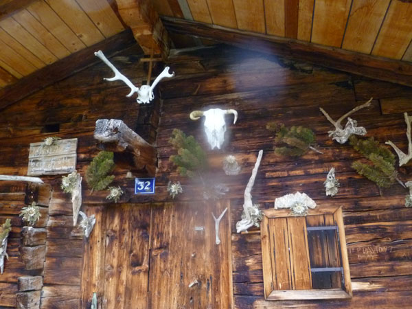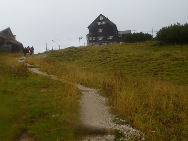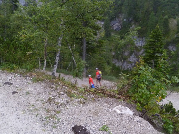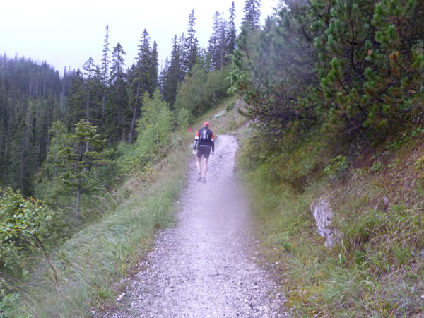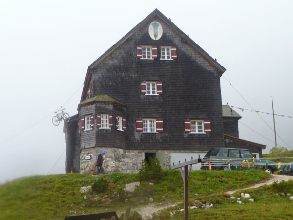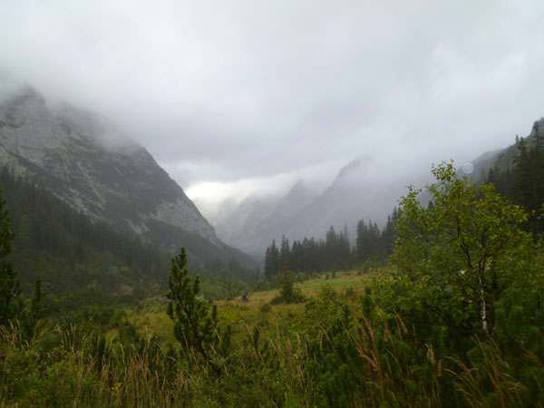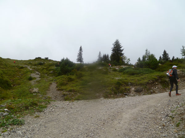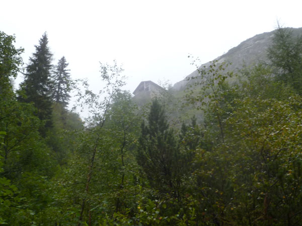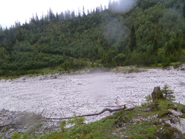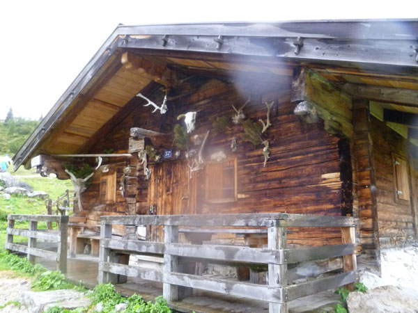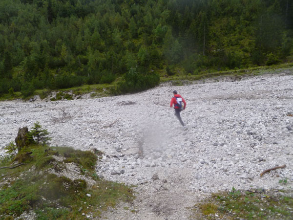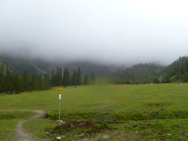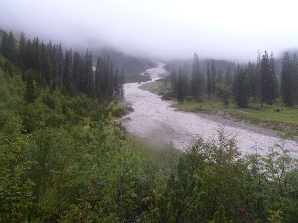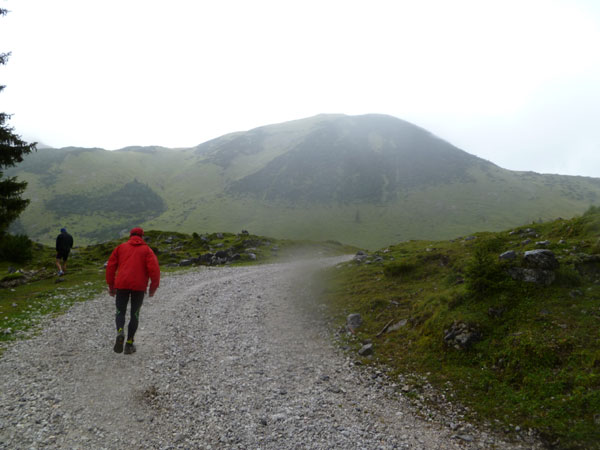 Nach einem langgezogenen Schotterfeld geht es wieder auffi. Erst noch relativ komfortabel durch lichte Wälder, aber nach der urigen Ladizalm wird es richtig steil. Eine Gruppe Berliner Jungs muss ihren Kameraden schon mächtig motivieren, damit er überhaupt noch weiter geht. Die letzten 300 Hm hinauf zur Falkenhütte haben es wirklich in sich. Normalerweise würden wir ja zur Entschädigung mit einem atemberaubenden Panorama auf die vor uns liegenden Ladiderer Wände belohnt, aber da ist heute leider Fehlanzeige, sie sind vollkommen in Wolken gehüllt. Dafür hat es aber wenigsten seit einiger Zeit mal wieder aufgehört zu regnen.