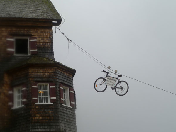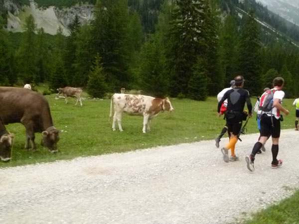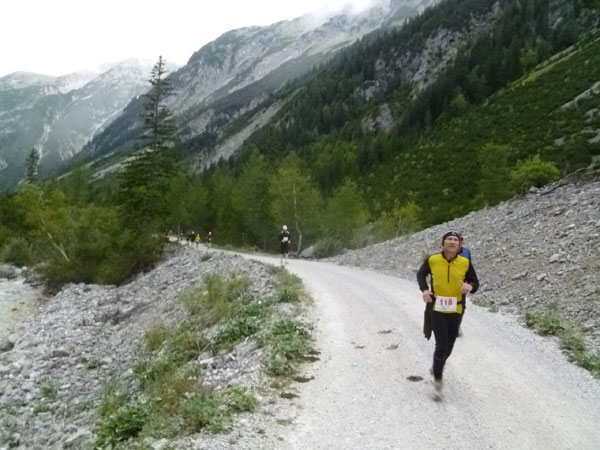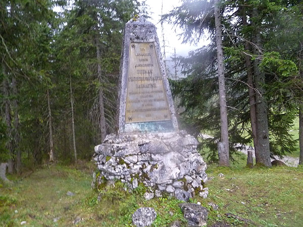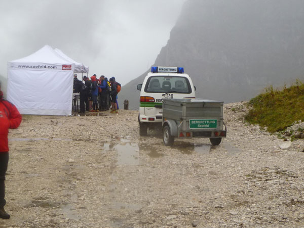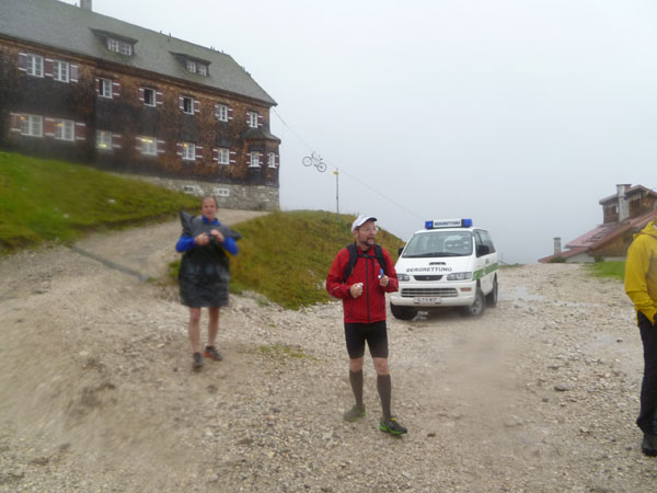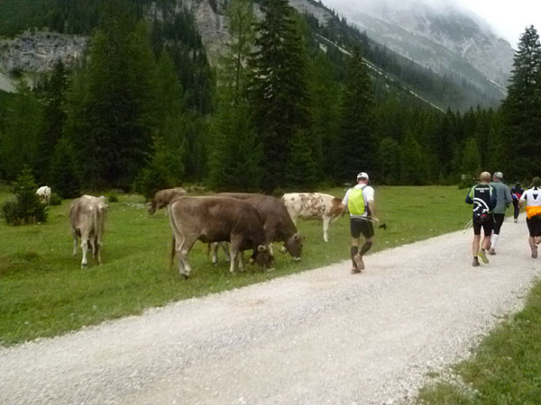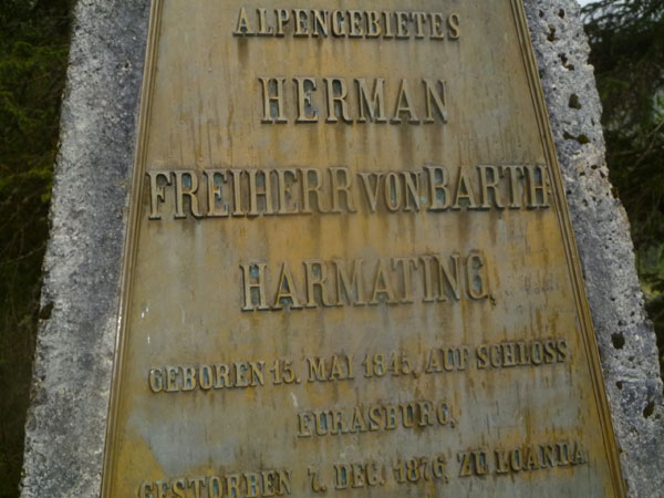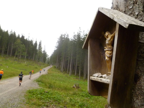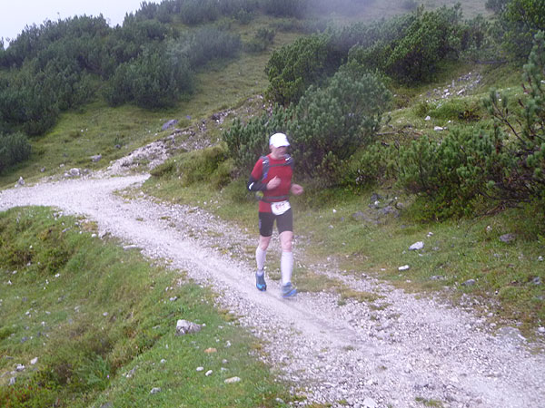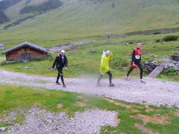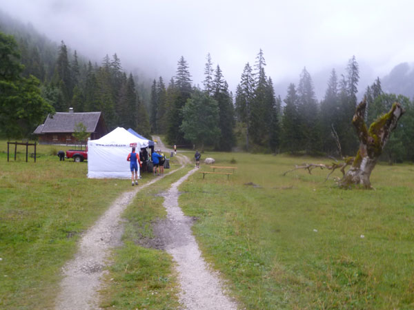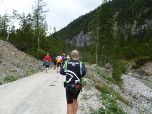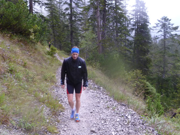 An der dort postierten Jausenstation drängen sich gerade viele Läufer unter das Zelt, da wieder ein anständiger Duscher vom Himmel kommt. Einer schnorrt sich ein paar Gummihandschuhe von den Helfern um seine Finger wenigstens etwas vor der Kälte zu schützen. Selbst dabei hat er, außer dem spärlichen Gewand das er an hat, nichts. Es hilft nix, ich muss weiter. Auf meine Kameralinse installiere ich ab hier den Wasserfilter, um auch möglichst authentische Bilder unserer Umstände liefern zu können …ha ha ha. Unmittelbar danach passiere ich das Denkmal des wilden Freiherrn Hermann von Barth, der in einem einzigen Sommer 88 Gipfel des Karwendel im Alleingang bestieg. Insgesamt kommt man ungefähr auf eine Zahl von 200 Spitzen, die teils skurrile Namen wie Hinterödkopf, Krapfenkarspitze, Fleischbank, Stierjoch oder Luderwände tragen.