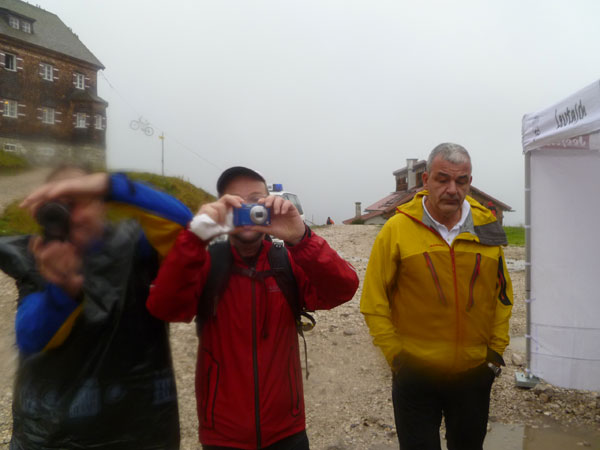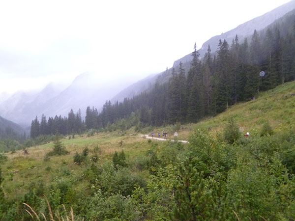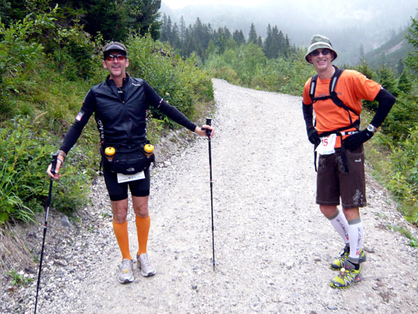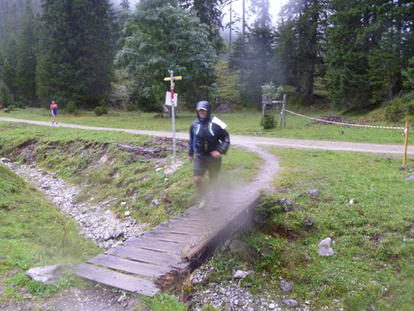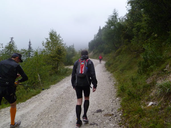 Nach einer ausgiebigen Stärkung nehme ich mit Günter und Wolfram im strömenden Regen den dritten und letzten Aufstieg in Angriff. Mit 650 Hm auf den nächsten 6 km ist er auch der steilste und schwierigste des ganzen Kurses. Um uns blitzt und donnert es in einer Tour. Die Feuchtigkeit dringt jetzt selbst durch meine Regenjacke mit einer Wassersäule von 10.000 mm und meine Hose ist vollkommen durchnässt, angenehm ist das nimmer. Weitere zusätzliche Wechselkleidung habe ich selbst am Start nicht für nötig gehalten.