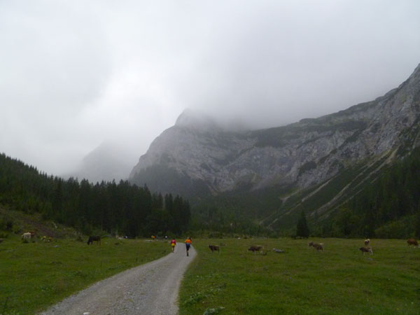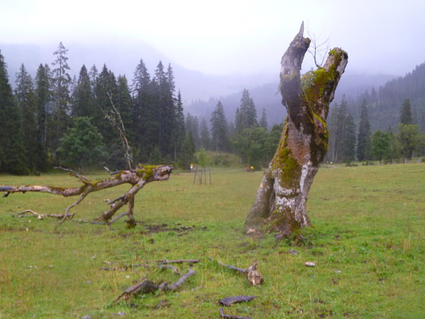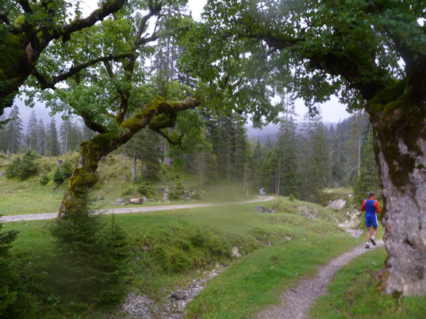 Tom und Dieter drängen zum Aufbruch. So schön es war, ich lasse sie ganz gerne davonziehen, sie sind nicht meine Kragenweite, haben ein wesentlich höheres Leistungsvermögen, was mich wahrscheinlich eher ins Verderben führen würde. Zudem ist der Ultra der Vorwoche bei mir auch noch deutlich spürbar. Bergab rauschen sie davon. Auf rustikalen Wegen geht es serpentinenartig runter zum Kleinen Ahornboden. Auf dem Almboden gibt es Bestände mit einzelnen bis zu 600 Jahre alten knorrigen Bergahornbäumen. Über Jahrhunderte waren das Tal in jedem Frühjahr überschwemmt. In Verbindung mit dem mageren Boden der Hochtäler wurden die Tannen und Fichten zurückgedrängt und der Bergahorn nutzte die Chance sich hier anzusiedeln. Selbst im Regen ist das Tal wunderschön anzusehen.