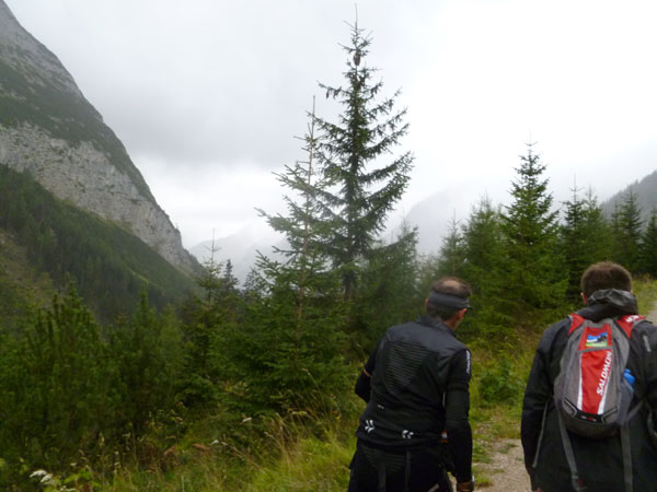 Kurz nach mir treffen meine Fotoreporter-Kollegen Günter Kromer und Wolfram Brunnmeier ein, wir haben uns seit dem Start aus den Augen verloren. Der Wolfram hat sich mittlerweile ganz schick in einen edlen Müllsack gezwängt. Steht ihm ganz gut, vielleicht nicht optimal figurbetonend, aber was macht man nicht alles um sich vor Nässe zu schützen. Als Paparazzi-Trio machen wir uns gemeinsam auf den weiteren Weg. Direkt unterhalb den furchterregenden Laliderer Wänden geht es für uns weiter. Die Kette aufeinanderfolgender, fast senkrechter Felswände ist eines der bekanntesten Klettergebiete der Nördlichen Alpen. Die Wände sind etwa 900 Meter hoch und reichen bis knapp unter die Gipfelbereiche von Laliderer Spitze (2.588 m) und Grubenkarspitze (2.663 m). Aber so weit nach oben können wir heute leider nicht sehen.