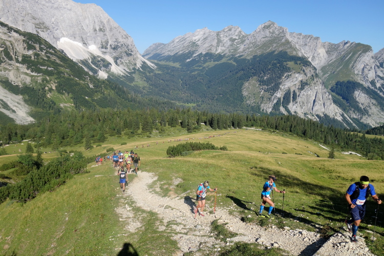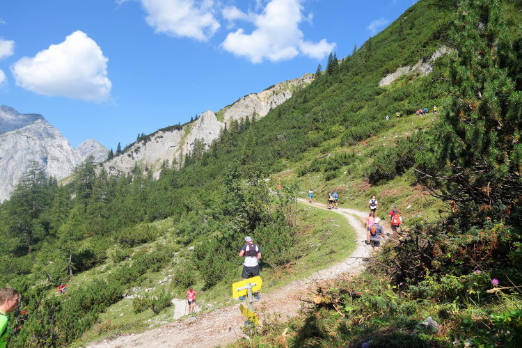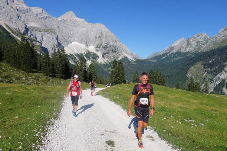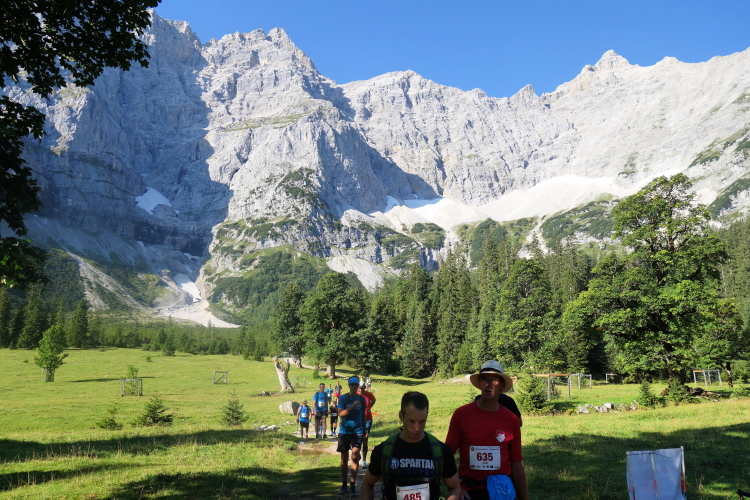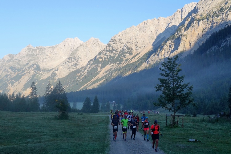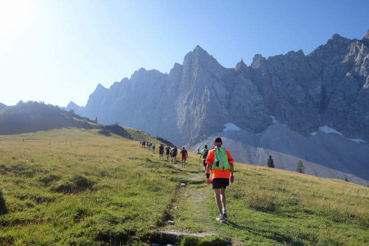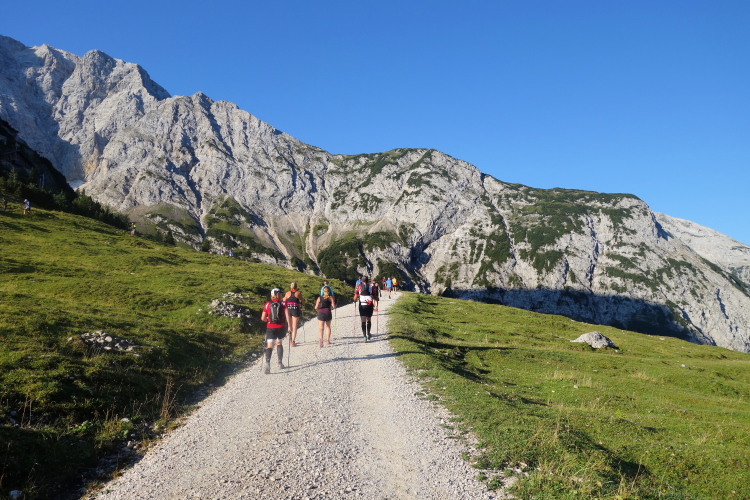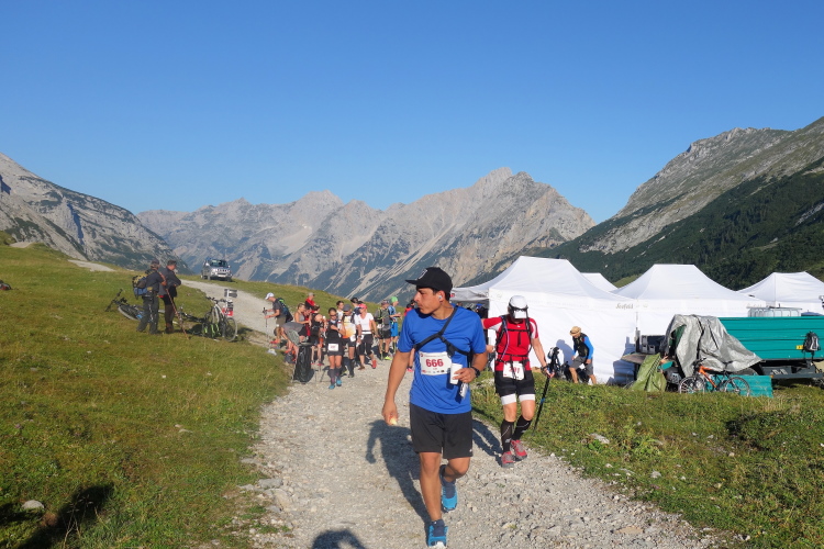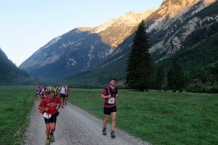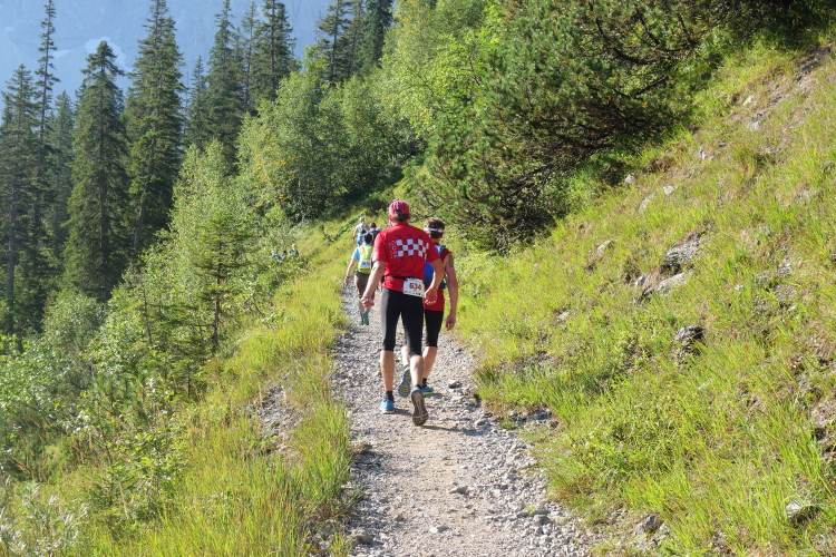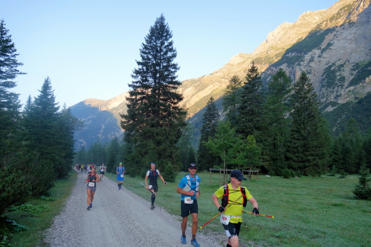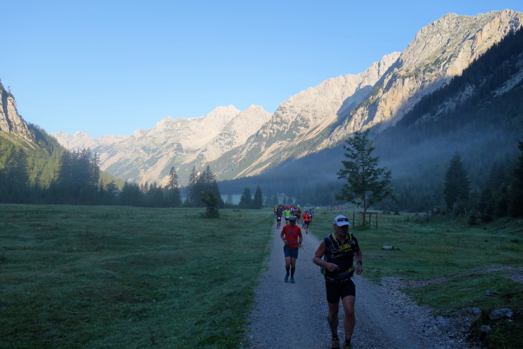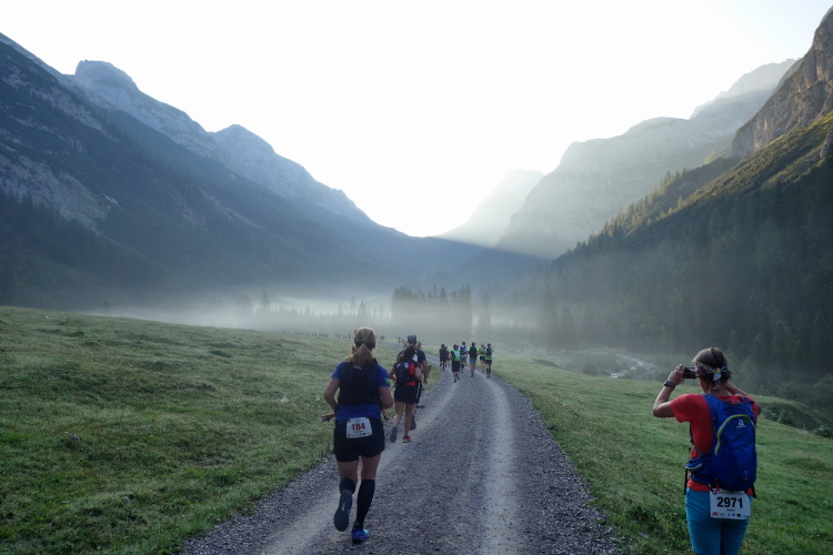An einigen Stellen liegen noch zarte Nebelschwaden im Tal. Sieht gut aus. Doch die Sonne kündigt sich schon in der Ferne immer stärker an. Ich bin froh, dass wir noch im Schatten laufen können. Warm, besser heiß und drückend, wird es noch früh genug werden. Gut, dass wir den langen Aufstieg Richtung Karwendelhaus (1.771 m) noch im Schatten machen können. Der Aufstieg ist schon so schwer genug. Alle gehen. Nichts ist mehr mit dem Wechsel Laufen – Gehen der vergangenen Km. Wie steht es so schön auf der Webseite des Veranstalters: "Laufen in der Marschklasse oder gehen in der Laufklasse ist kein Disqualifikationsgrund." Also spare ich meine Körner bei den Anstiegen. Gehend bin ich bergauf eh kaum langsamer als laufend.
