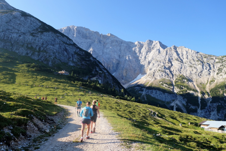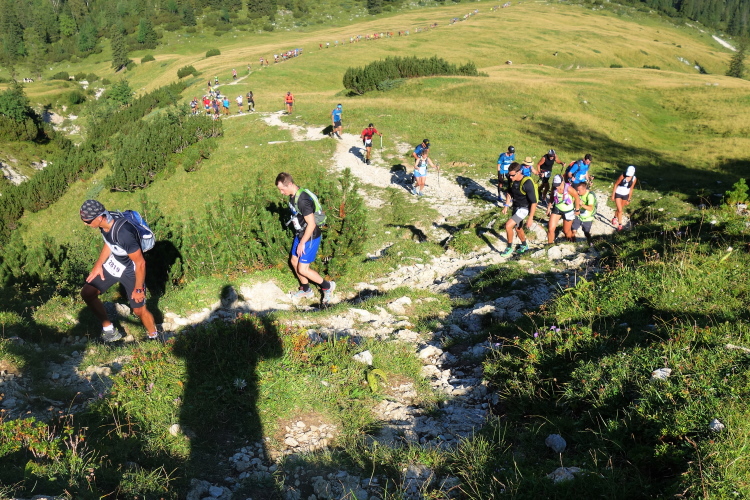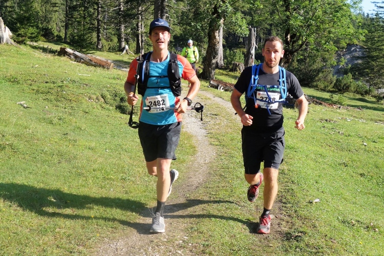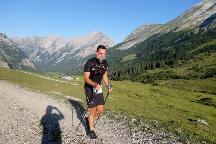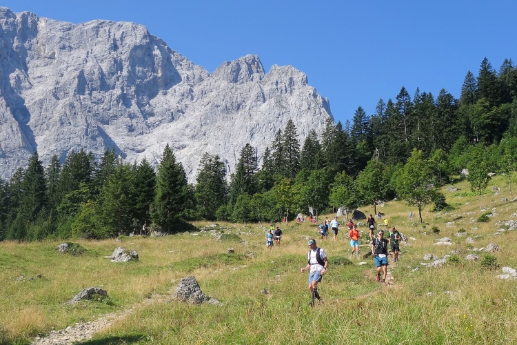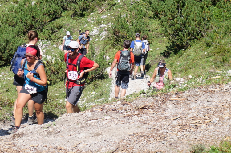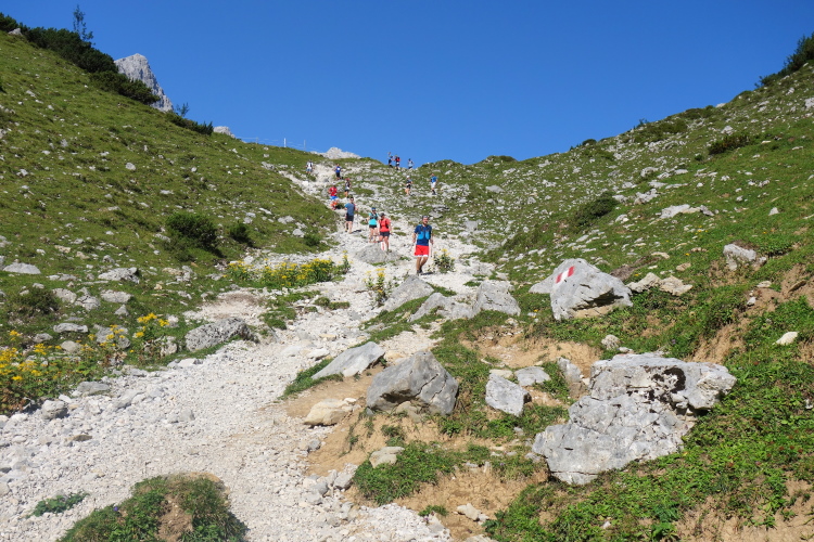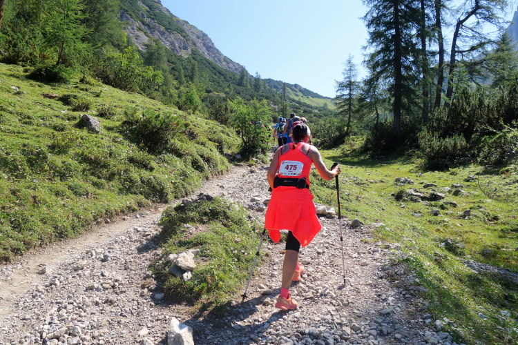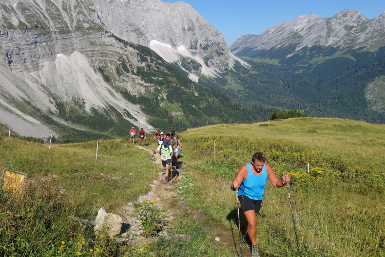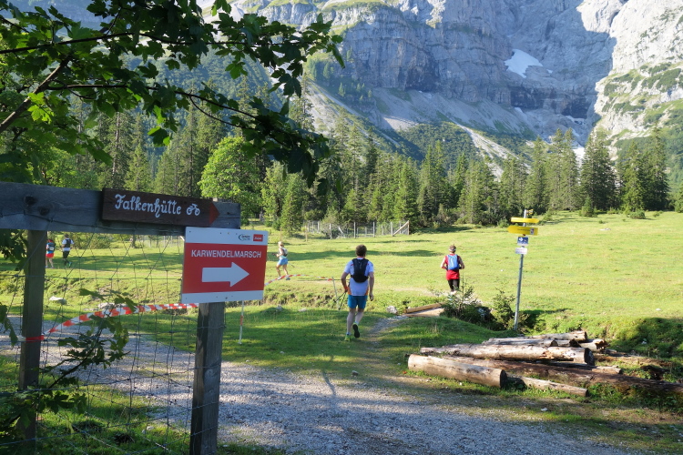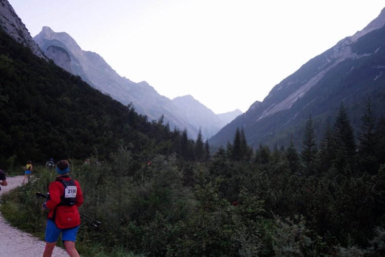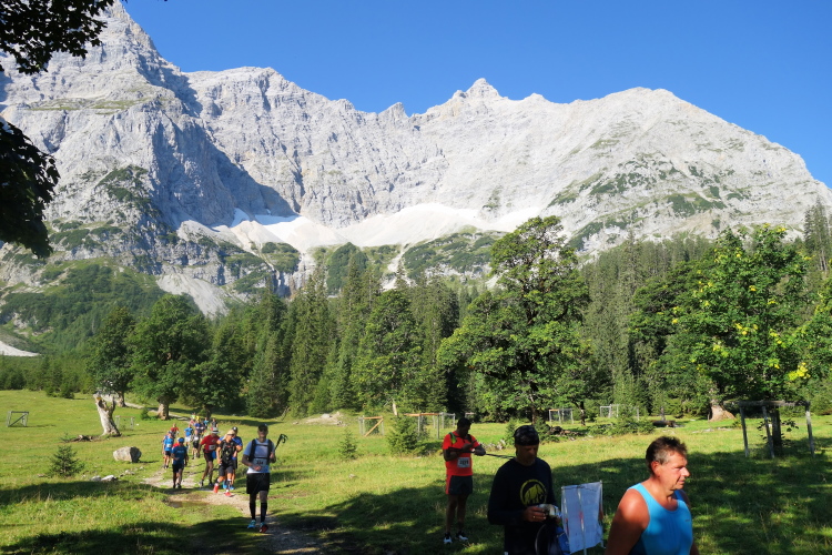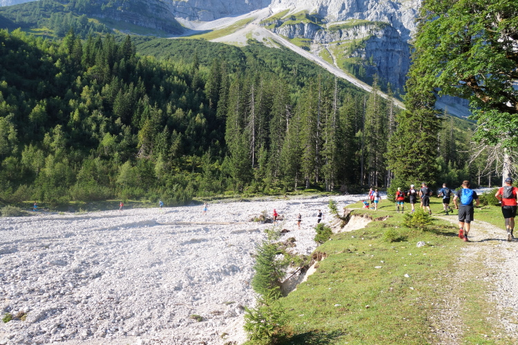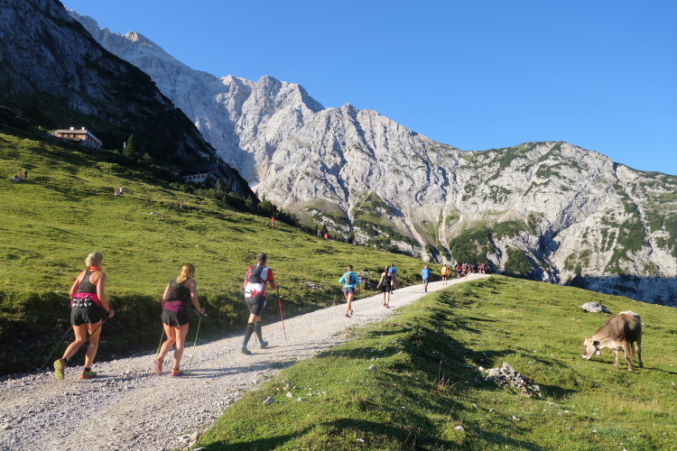 An einigen Stellen liegen noch zarte Nebelschwaden im Tal. Sieht gut aus. Doch die Sonne kündigt sich schon in der Ferne immer stärker an. Ich bin froh, dass wir noch im Schatten laufen können. Warm, besser heiß und drückend, wird es noch früh genug werden. Gut, dass wir den langen Aufstieg Richtung Karwendelhaus (1.771 m) noch im Schatten machen können. Der Aufstieg ist schon so schwer genug. Alle gehen. Nichts ist mehr mit dem Wechsel Laufen – Gehen der vergangenen Km. Wie steht es so schön auf der Webseite des Veranstalters: "Laufen in der Marschklasse oder gehen in der Laufklasse ist kein Disqualifikationsgrund." Also spare ich meine Körner bei den Anstiegen. Gehend bin ich bergauf eh kaum langsamer als laufend.