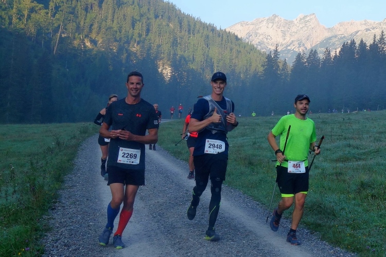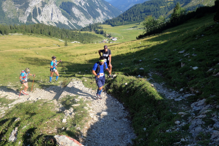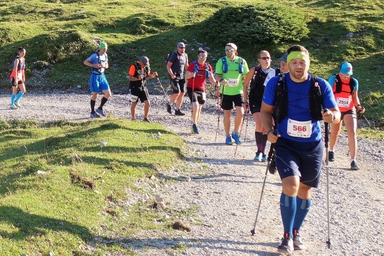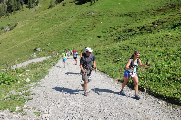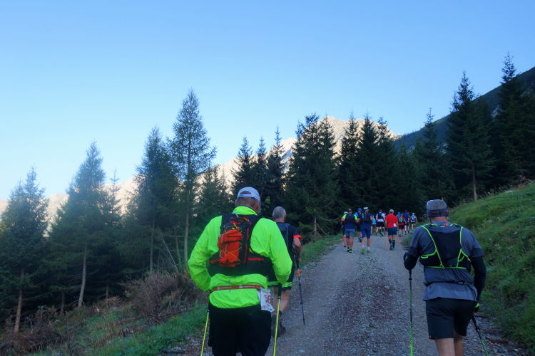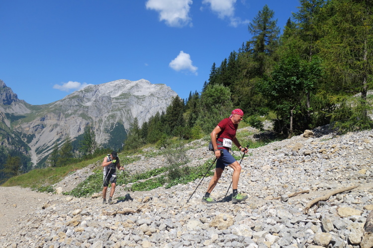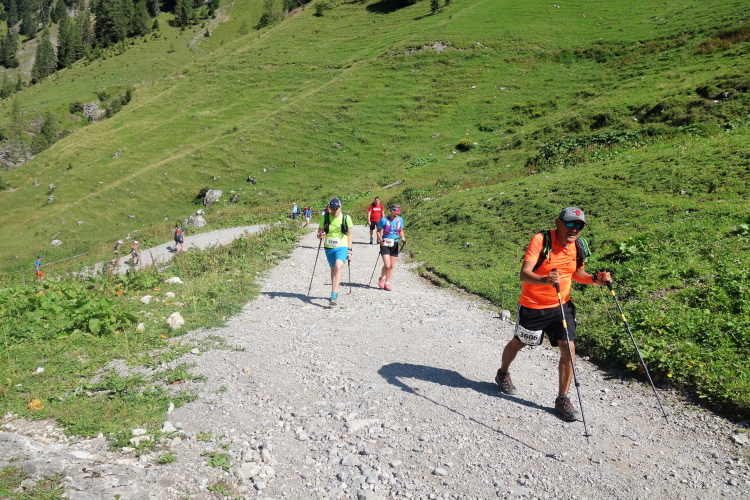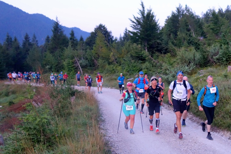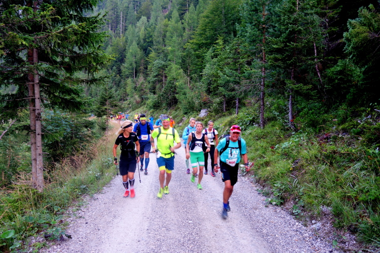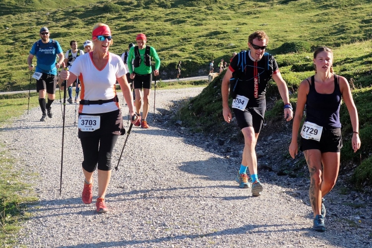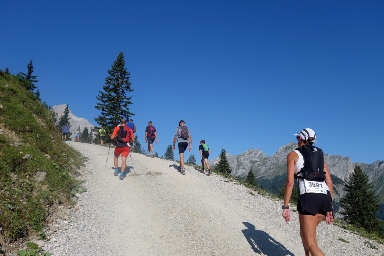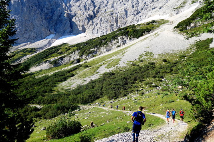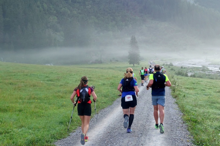 An einigen Stellen liegen noch zarte Nebelschwaden im Tal. Sieht gut aus. Doch die Sonne kündigt sich schon in der Ferne immer stärker an. Ich bin froh, dass wir noch im Schatten laufen können. Warm, besser heiß und drückend, wird es noch früh genug werden. Gut, dass wir den langen Aufstieg Richtung Karwendelhaus (1.771 m) noch im Schatten machen können. Der Aufstieg ist schon so schwer genug. Alle gehen. Nichts ist mehr mit dem Wechsel Laufen – Gehen der vergangenen Km. Wie steht es so schön auf der Webseite des Veranstalters: "Laufen in der Marschklasse oder gehen in der Laufklasse ist kein Disqualifikationsgrund." Also spare ich meine Körner bei den Anstiegen. Gehend bin ich bergauf eh kaum langsamer als laufend.