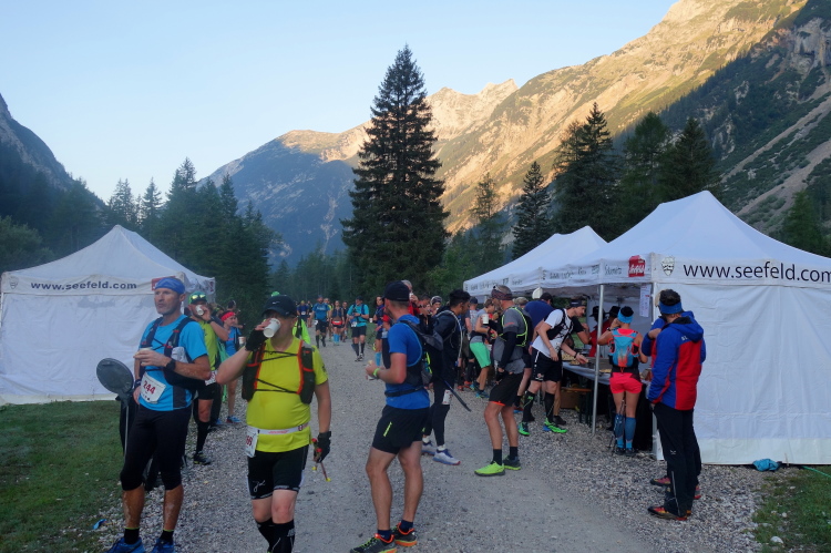 Am Startgelände gebe ich meinen Kleiderbeutel fürs Ziel in Pertisau ab. Von dort will ich am Nachmittag auf das Angebot des Veranstalters zum Rücktransport mittels Busshuttle zurückgreifen und wieder nach Scharnitz kommen. Ein prima Angebot und gut investierte 15 € an Transportkosten.