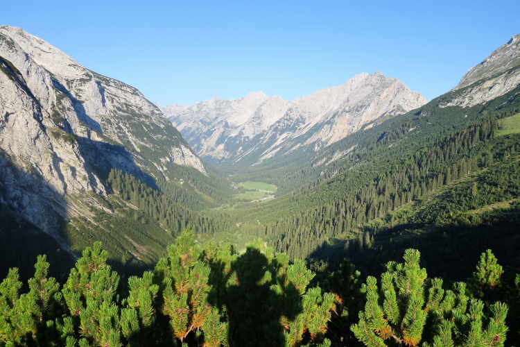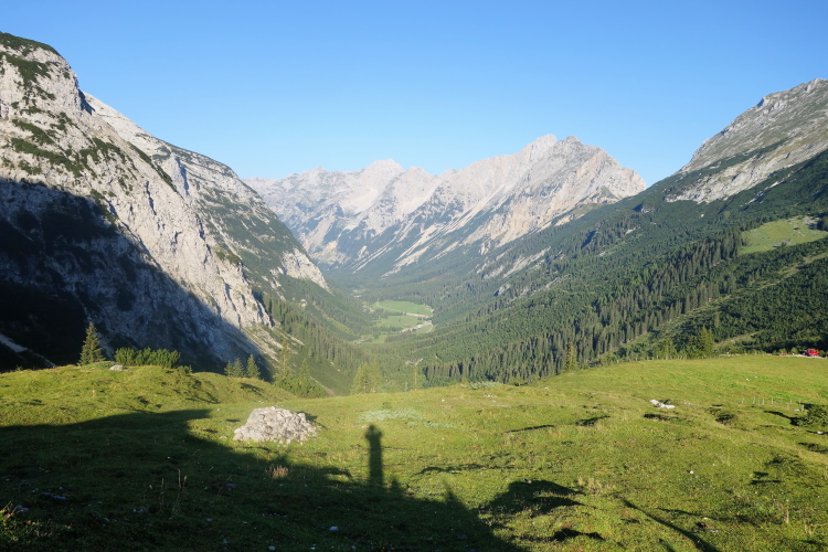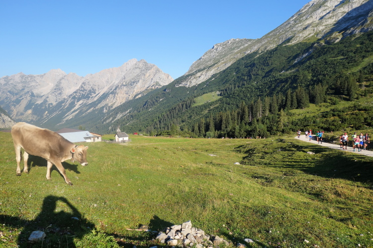 Uns bieten sich viele schöne Blicke auf die zurückgelegte Laufstrecke. Der gesamte Karwendel liegt nun in der Sonne und auch wir verlassen den Schatten und werden von der Morgensonne erfasst. Das Karwendelhaus liegt nun vor uns, wir laufen aber etwas unterhalb vorbei. Die grasenden Kühe lassen sich durch uns nicht stören. Ein schönes Bild das sich uns hier oben bietet.