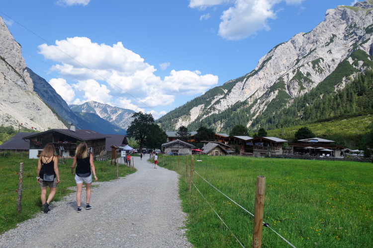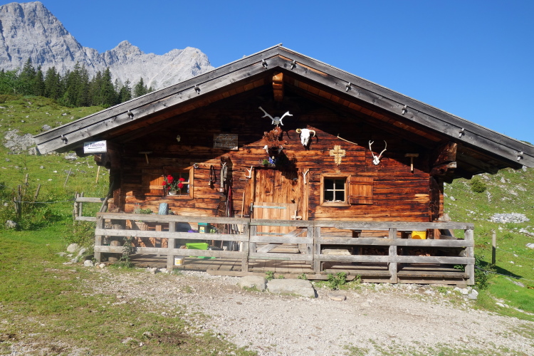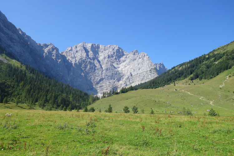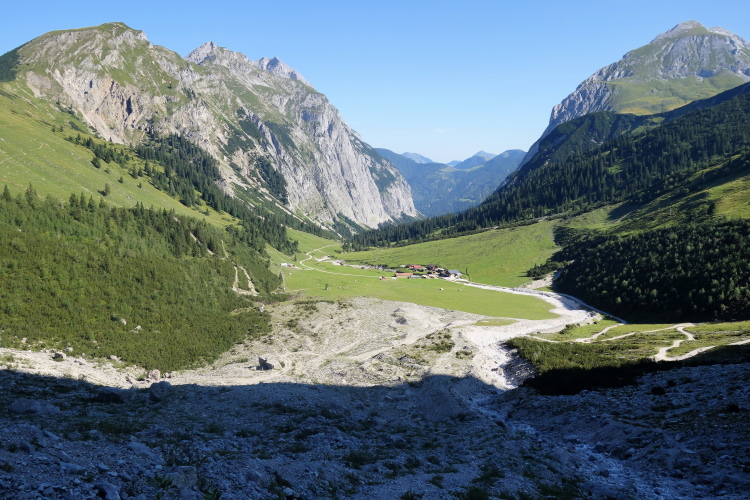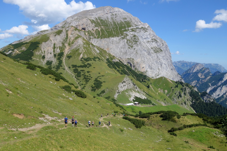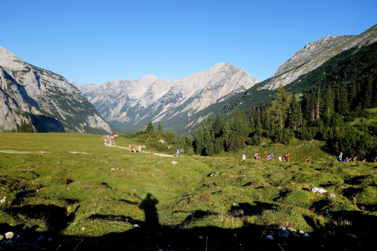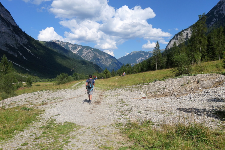 Unser nächstes Ziel ist die Falkenhütte. Ich staune über die kolossalen Wände des Karwendelgebirges. Rechter Hand stehen imposante Berge mit schwierig zu durchsteigenden Wänden. Hier wurde Alpingeschichte geschrieben.