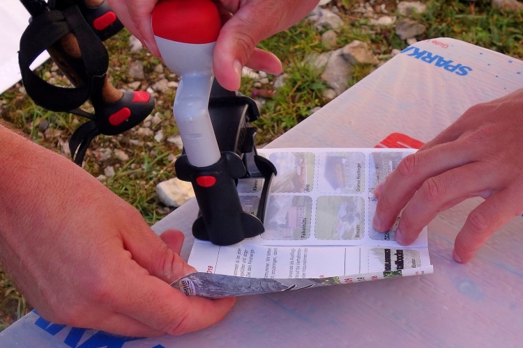 Wir müssen noch einige Serpentinen höher steigen. Ich sehe weiß blühendes Gras, das mich an Wollgras erinnert, und verblühten gelben Enzian. An der VS gibt es neben Getränken und Obst und Keksen auch Brote und Kartoffelsuppe. Ich lasse mir ein Brot schmecken. Wer mag, kann sich auch die Stempelkarten abstempeln lassen.