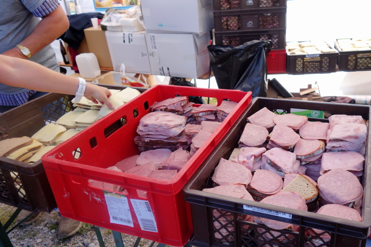 Mehrfach wecheln wir über Brücken die Seiten des Karwendelbachs. Die schon erwähnte erste Labestation wird erreicht. Am Schafstallboden (1.173 m) erwarten und Obst und Kekse sowie Getränke. Es werden übrigens recyclingfähige Trinkbecher aus Pappe verwendet. Der Karwendellauf wird immer ökologischer. Sehr gut und nachahmenswert.