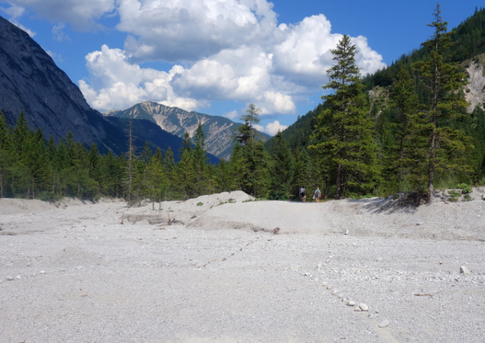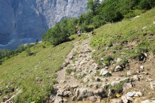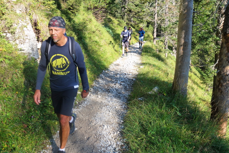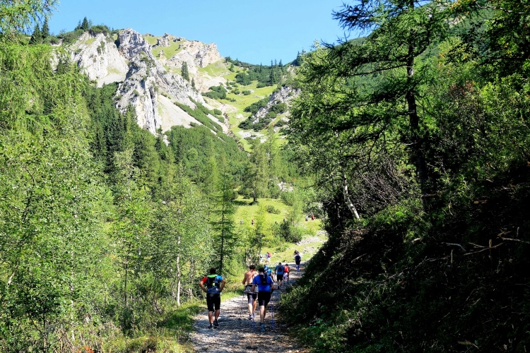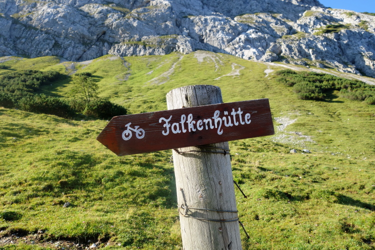 Es ist wunderschön durch den Sauisswald zu laufen. Mehrere Schutthänge sind zu queren. Beim ersten geht es eine ordentliche Böschung nach unten. Ab der Ladizalm (1.573 m) laufen wir ein Stück auf dem Adlerweg – und das mit ordentlicher Steigung. Es ist ein langer Anstieg, bis wir die Falkenhütte (1.848 m) endlich erreichen.
