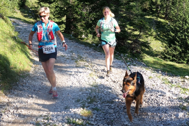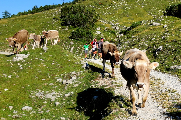 Auf dem Weg abwärts vom Hochalmsattel sind viele Kühe, einige begleiten die Läufer ein Stück abwärts. Die wollen doch nicht etwa auf uns los? Nein, ein kleiner Anstieg bremst sie. Sie sind nicht so verrückt wie wir und bleiben stehen. Wir laufen weiter.